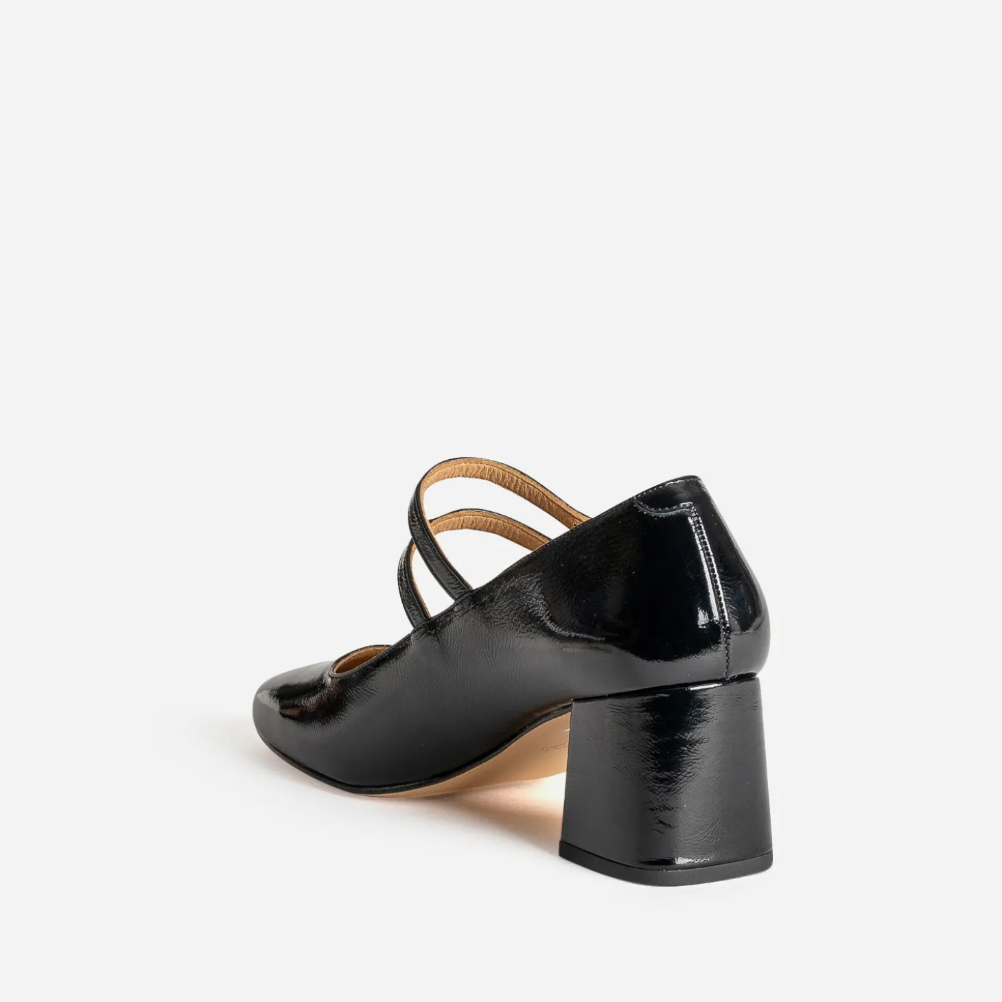 La mode, un éternel recommencement qui se confirme par le retour en force de la babies. Confectionnée en cuir noir, elle s’autorise une finition vernie jusqu’à la pointe de son talon carré, légèrement flare. Le pied est maintenu par deux fines brides parallèles, fermées par des boucles. Un modèle idéal, pour twister une blouse et un jean cropped, dans un esprit rétro.