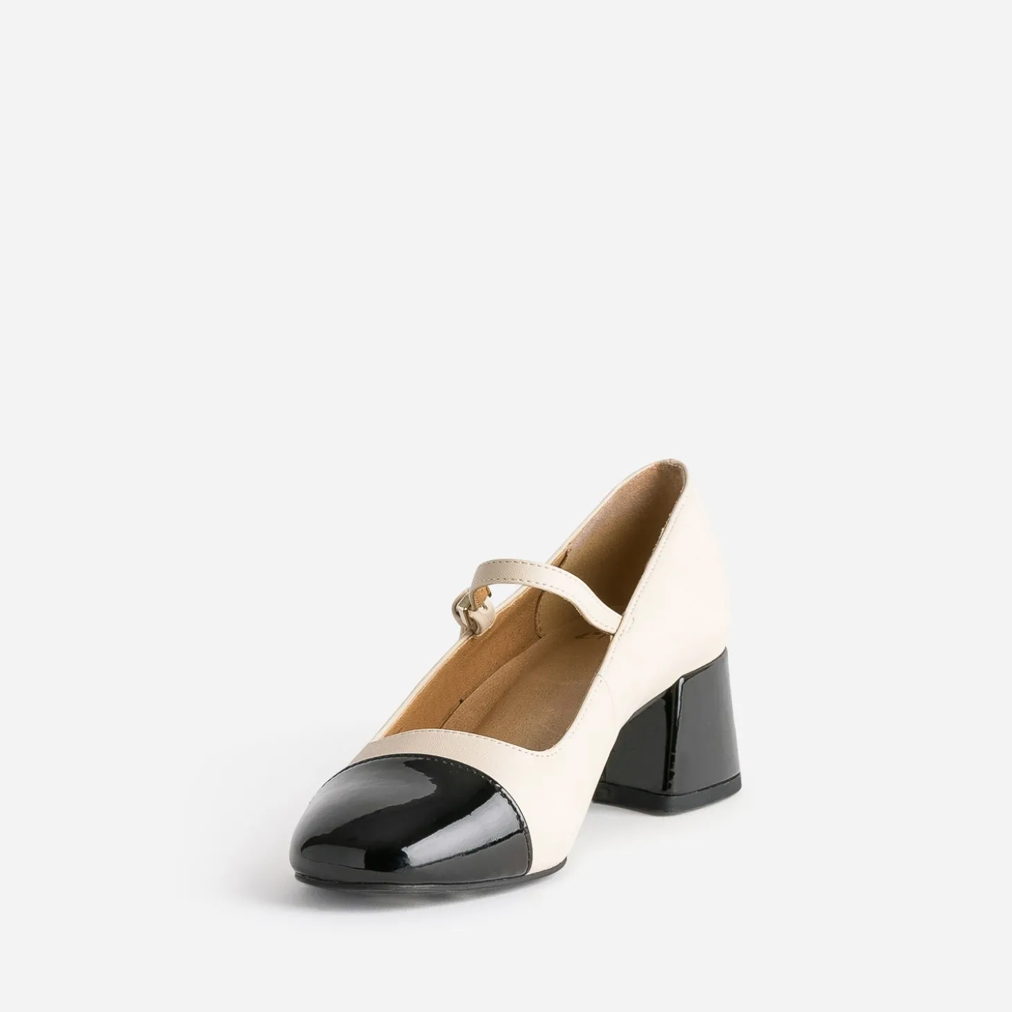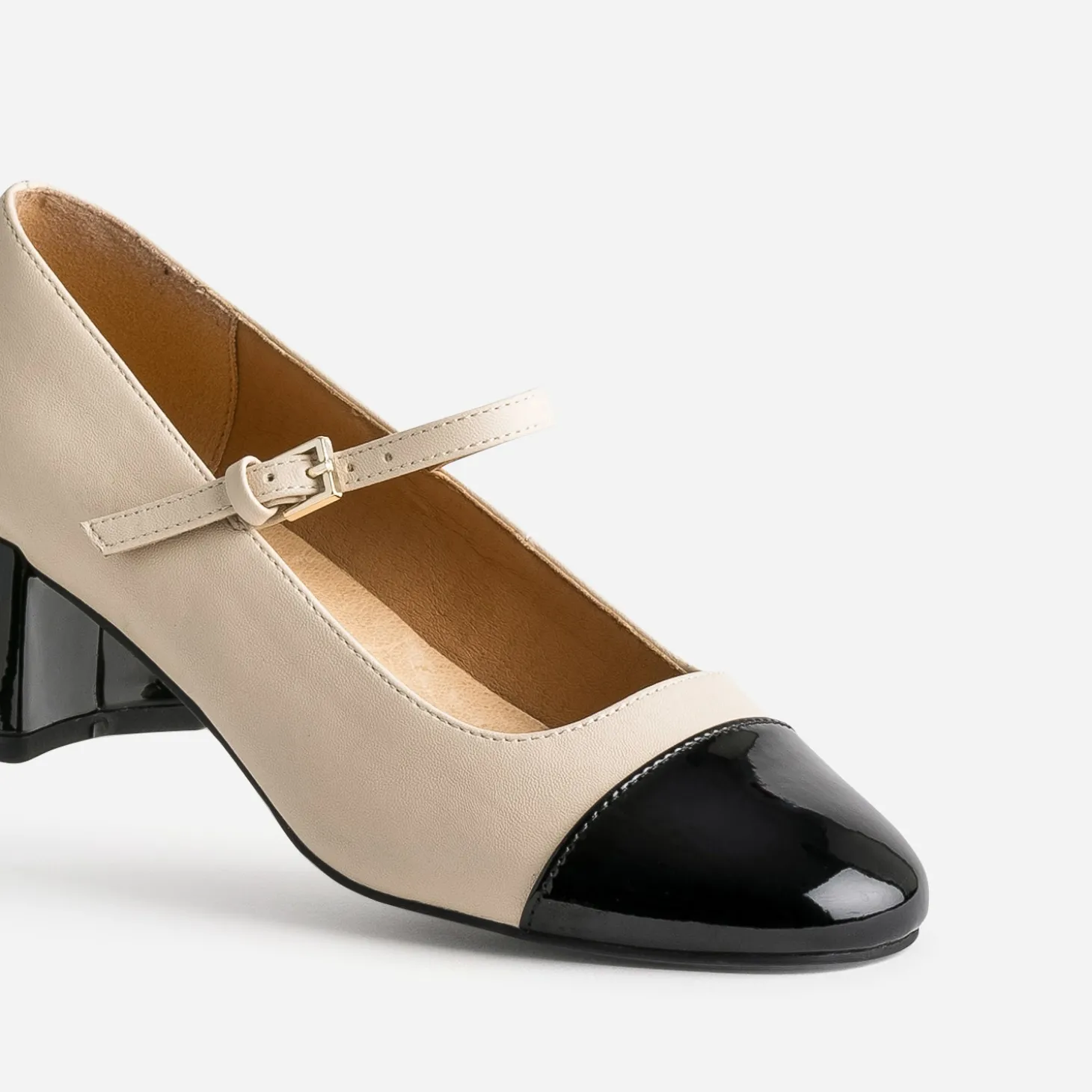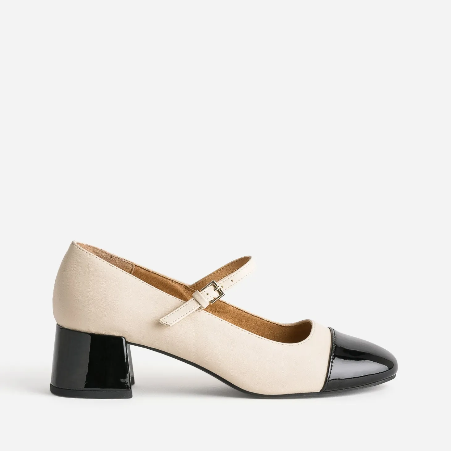 Ancrée dans un style classique chic, la babies s’impose dans le shoesing féminin de la saison. En matière synthétique lisse, elle associe un beige neutre et mat à un bout et talon recouvert noirs avec finition vernie. Elle est maintenue au pied, par une fine bride, fermée par une boucle. Un modèle à jouer avec une veste de blazer, ceinturée sur un jupon midi en tulle noir.