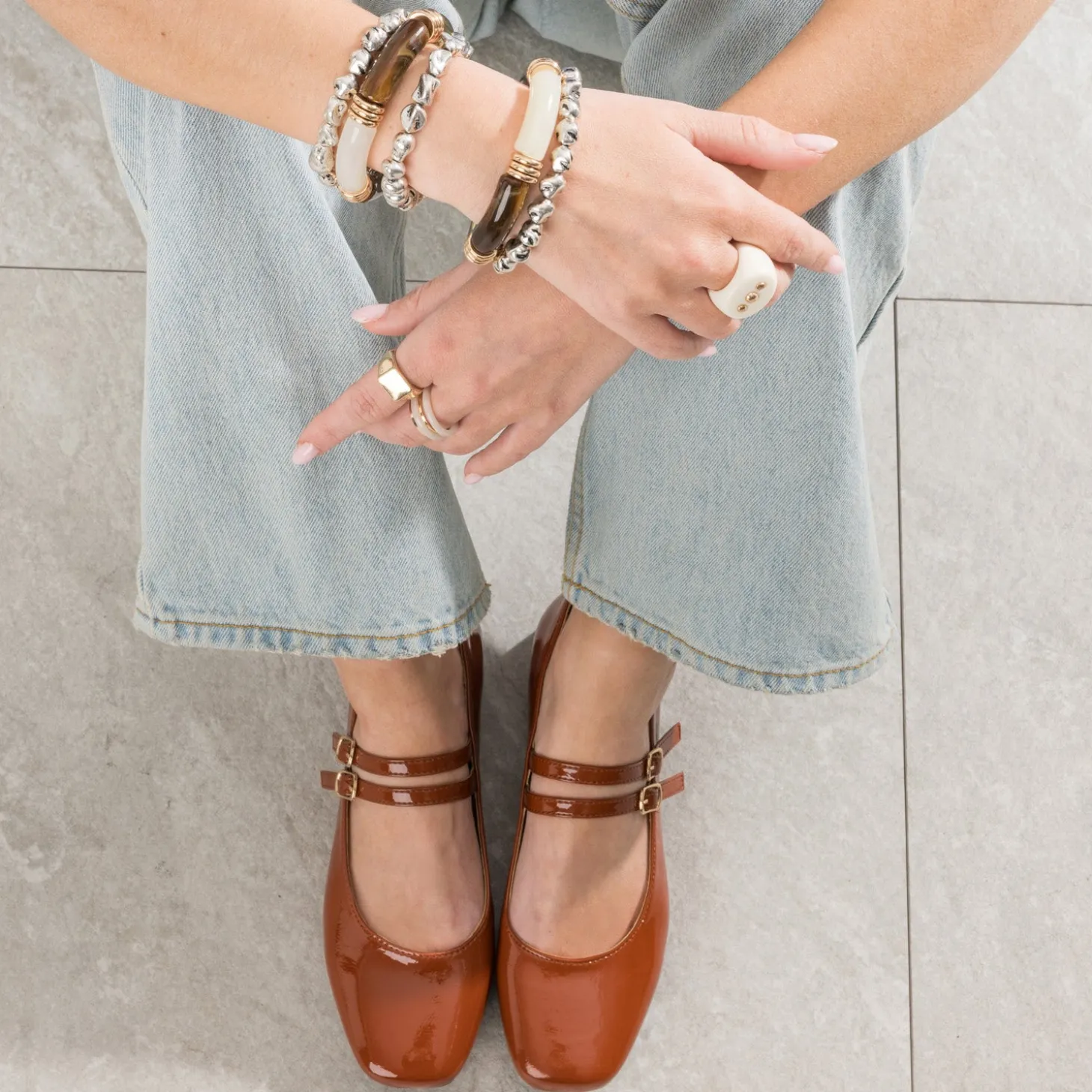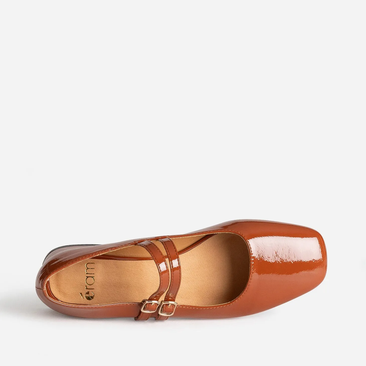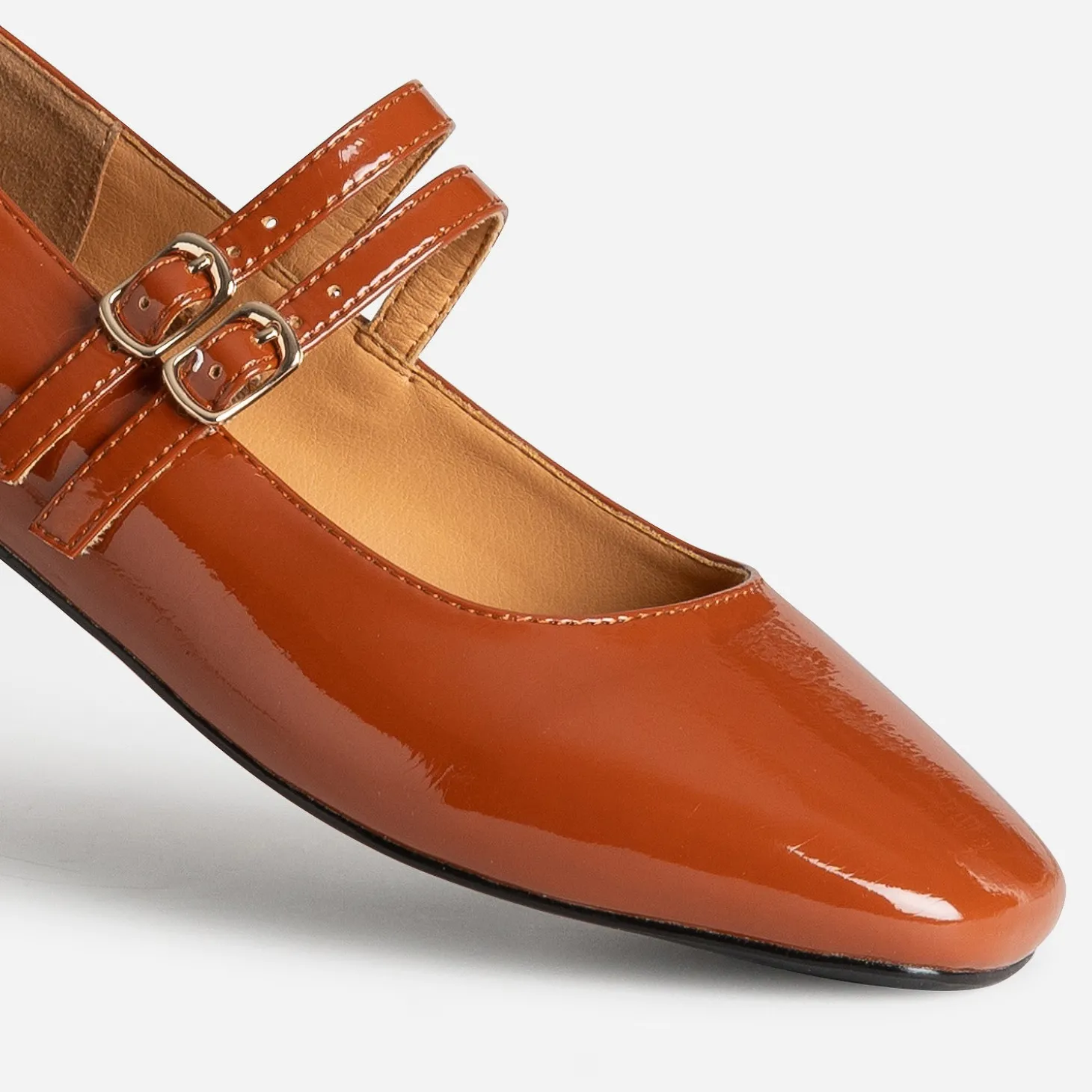 Deux fines brides parallèles, sur le dessus du pied : c’est la signature de la babies pour femme. En matière synthétique vernie, elle s’invite dans les tendances du moment, par son coloris cognac, et se laisse moderniser par un bout carré et un petit talon forme flare. Un modèle à essayer avec un costume à motif carreaux, à décaler avec un jean cropped oversize gris et un sweat rouge.