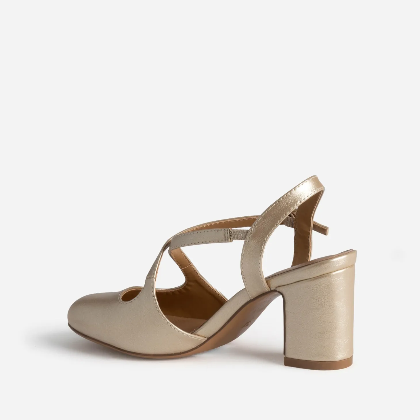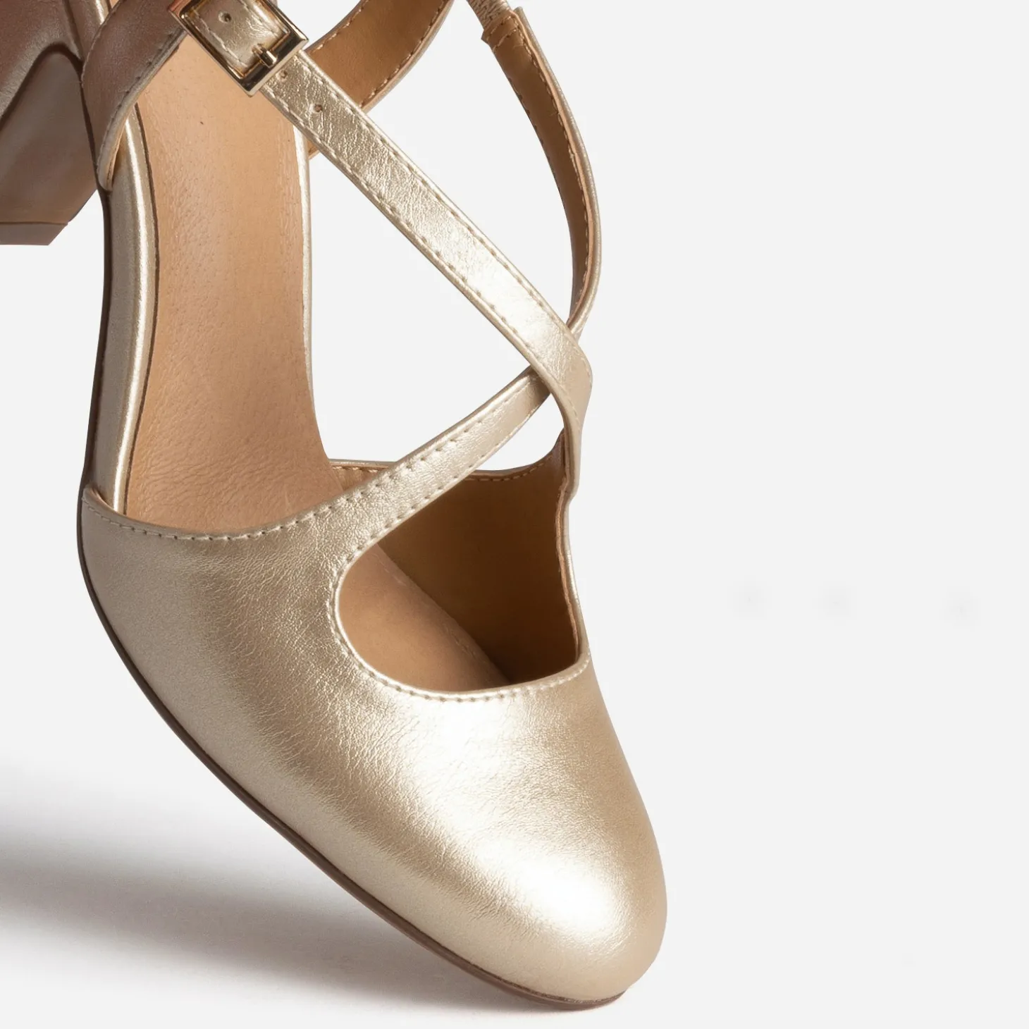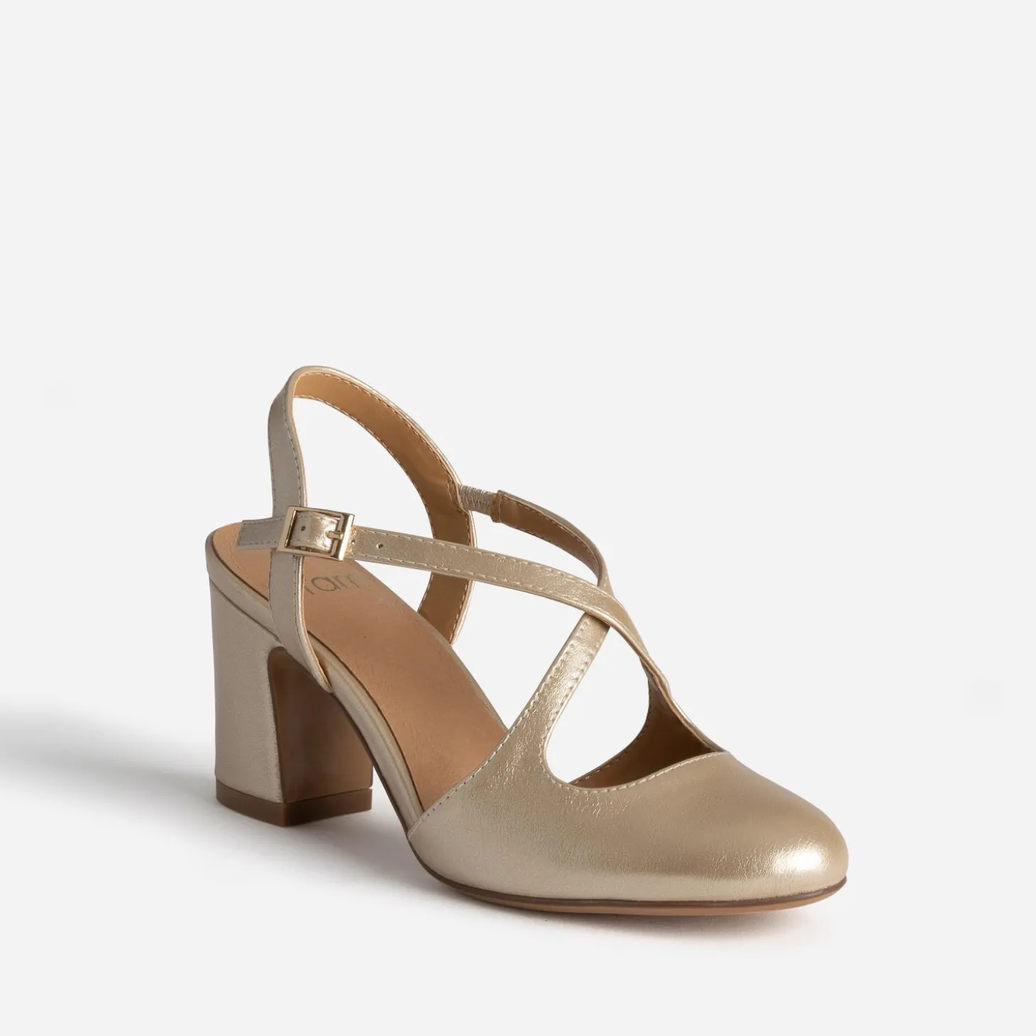 Envie de talon tout en ayant le pied parfaitement maintenu ? Optez pour la babies, dotées de brides, ici croisées, sur le dessus du pied. Sa ligne d’inspiration rétro est confortée par un talon carré de 7 cm, et une semelle première moussée très confortable. Son coloris doré s’invite, sans modération, dans les tenues de cérémonie d’été.