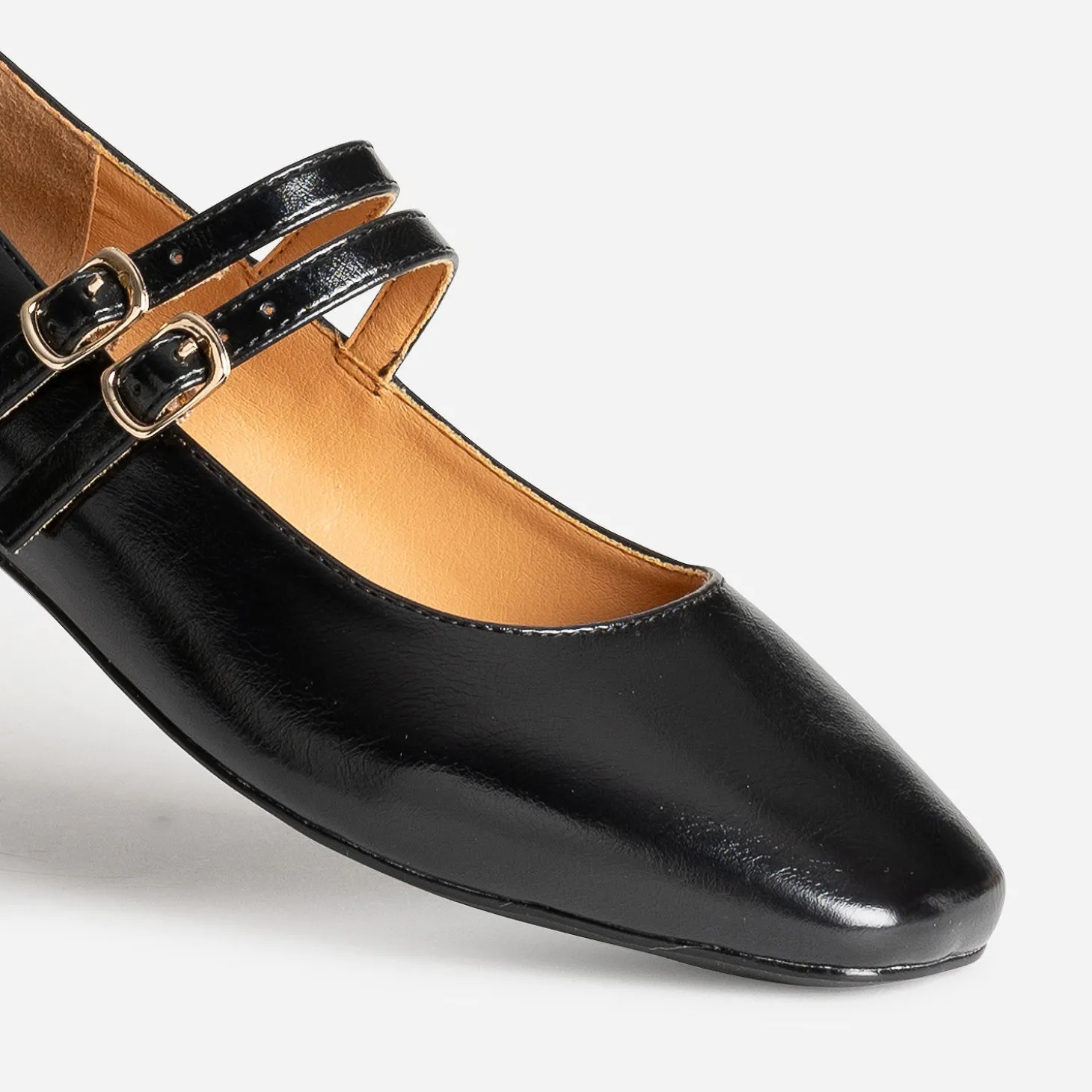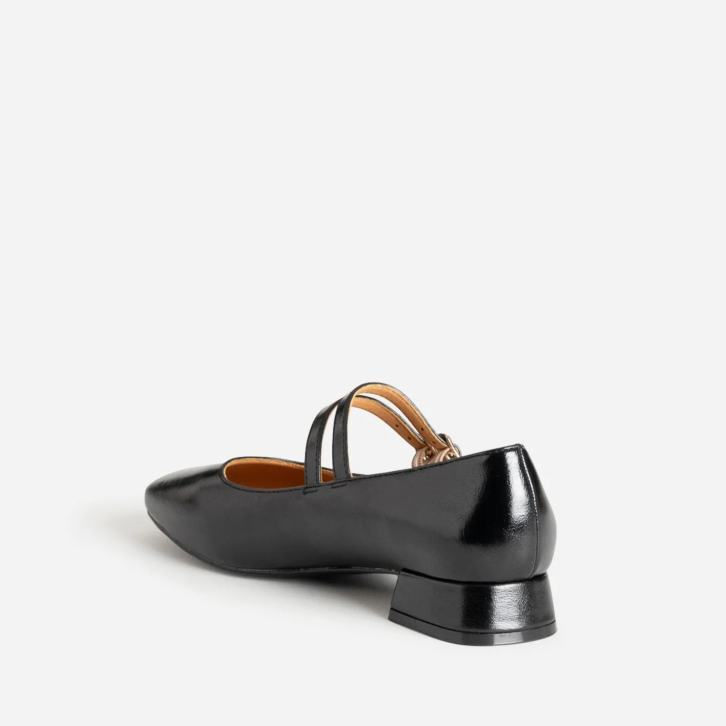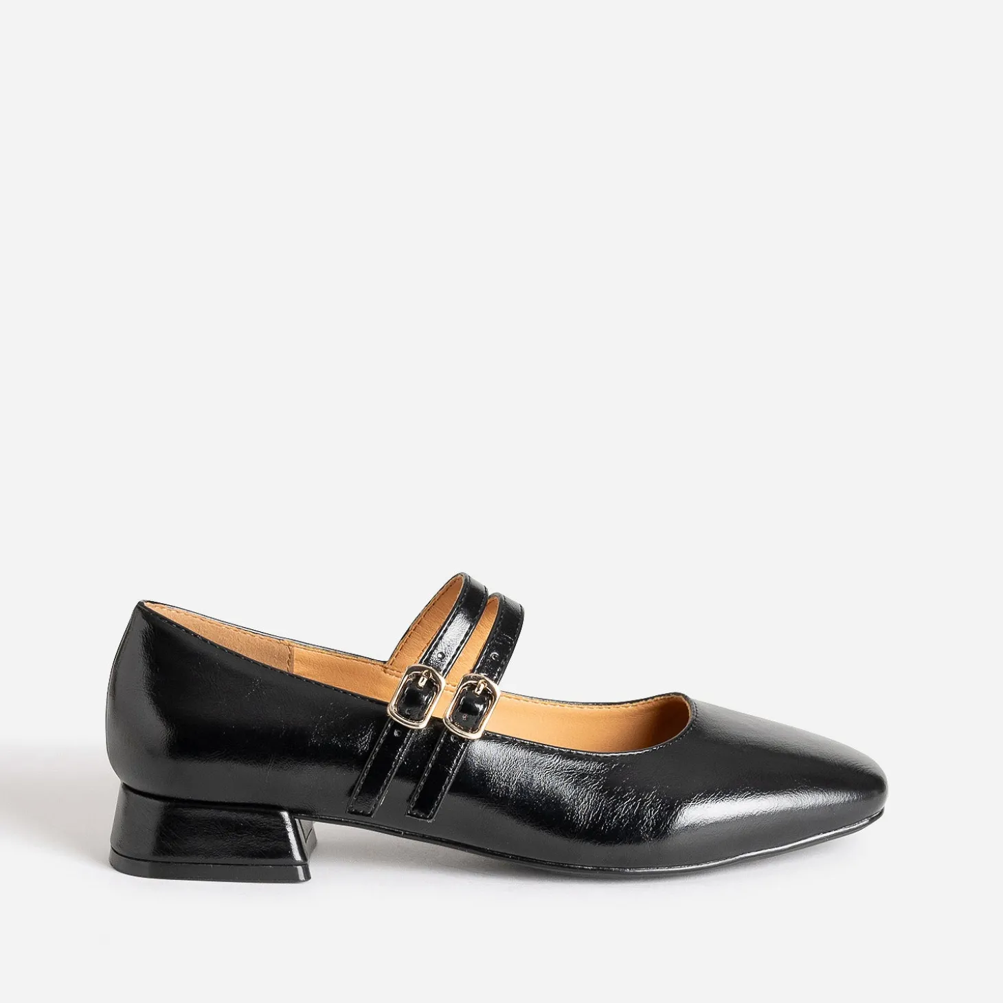 Deux fines brides parallèles, sur le dessus du pied : c’est la signature de la babies pour femme. En matière synthétique lisse, elle conserve son statut d’essentiel, par son coloris noir, et se laisse moderniser par un bout carré et un petit talon forme flare. Un modèle à essayer avec un costume à motif carreaux, à décaler avec un jean cropped oversize gris et un sweat rouge.