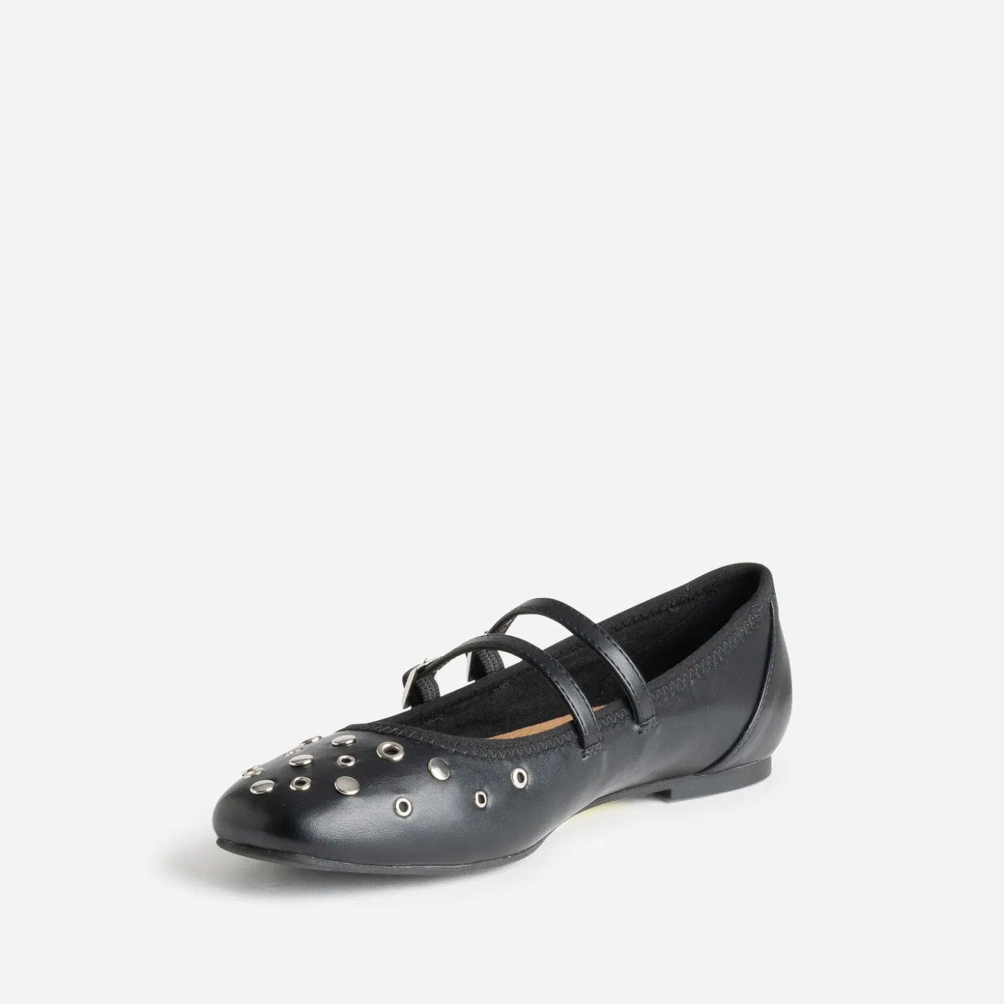 Rétro et rock. Cette babies pour femme réalise le défi de combiner deux grandes tendances de la saison. En matière synthétique lisse, elle se décline en coloris noir, décorée d’œillets et de clous. Le maintien est assuré par deux fines brides parallèles sur le dessus du pied. Un modèle plat à tester, pour la rentrée, avec une chemise blanche cropped et un pantalon de costume large gris anthracite.