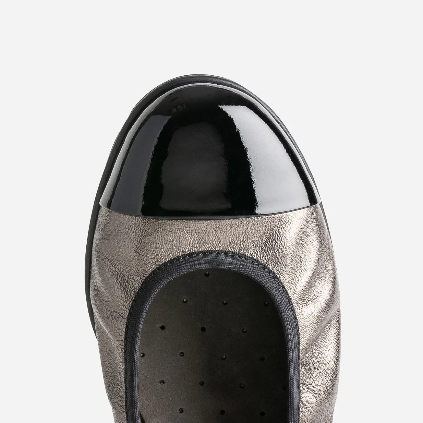 Laissez-vous séduire par la souplesse incroyable de son cuir souple non doublé, animé d’une finition métallisée. La semelle première en cuir est dotée de la technologie ‘onAIR’, garantissant un meilleur amorti et une aération optimale de la chaussure. Coloris bronze, elle est finalisée par un bout et un contrefort noir verni, dans une belle harmonie.