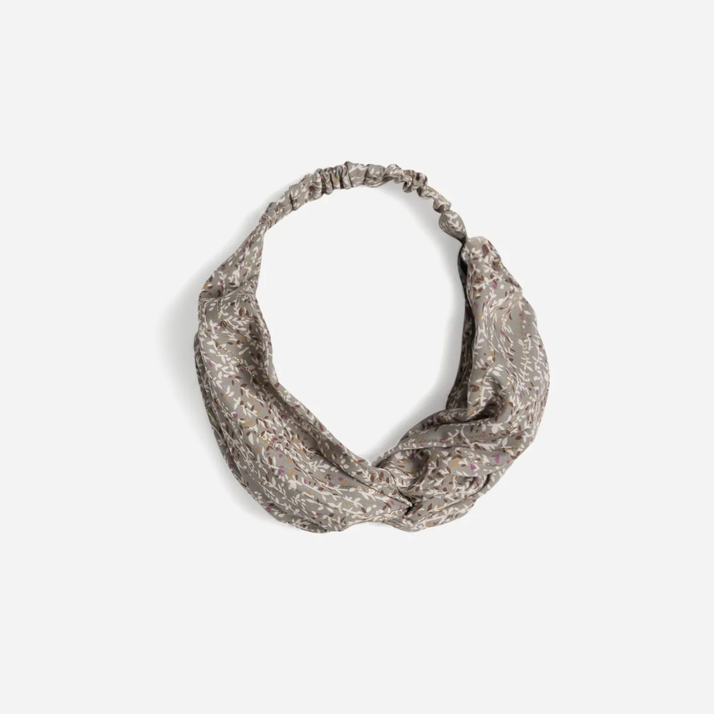 L’accessoire idéal pour maintenir une jolie coiffure d’été ? Le bandeau. En tissu vert sauge, il associe un imprimé floral minimaliste et des rayures dorées. Devant, un nœud fantaisie, Derrière, un élastique pour le confort. Jouez-le avec une tenue dans les tons kaki, violet, marron ou écru.