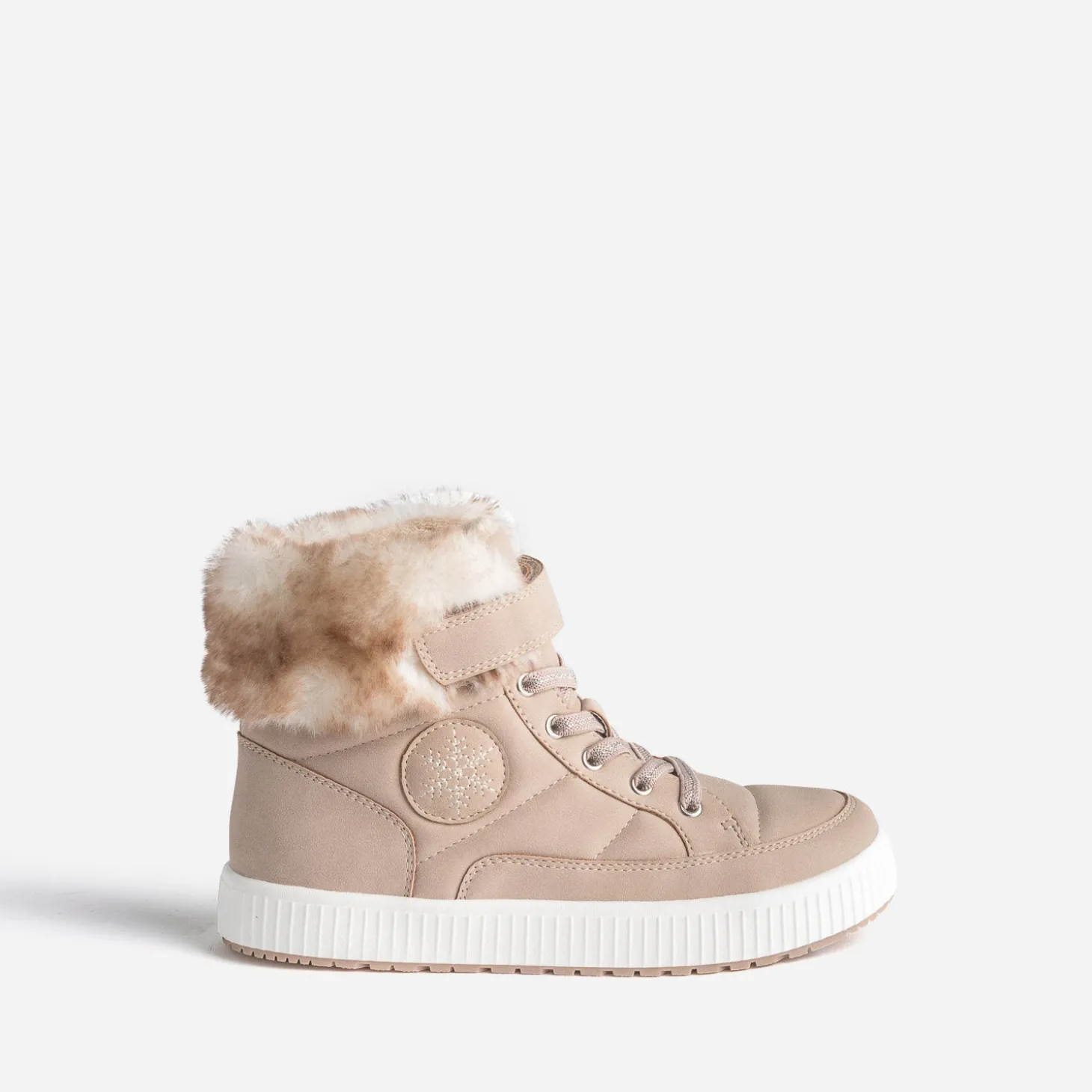 Elle ne jure que par les baskets ? Vous aimeriez qu’elle est bien chaud aux pieds ? Optez pour ce modèle junior fille, montant et entièrement fourré. Coloris beige rosé, il se ferme par un lacet élastiqué avec ligne pailletée, renforcé par un scratch. Associez-la avec ses looks du quotidien, denim bleu ou total look gris.