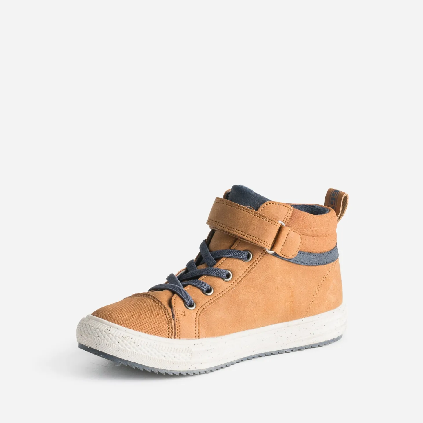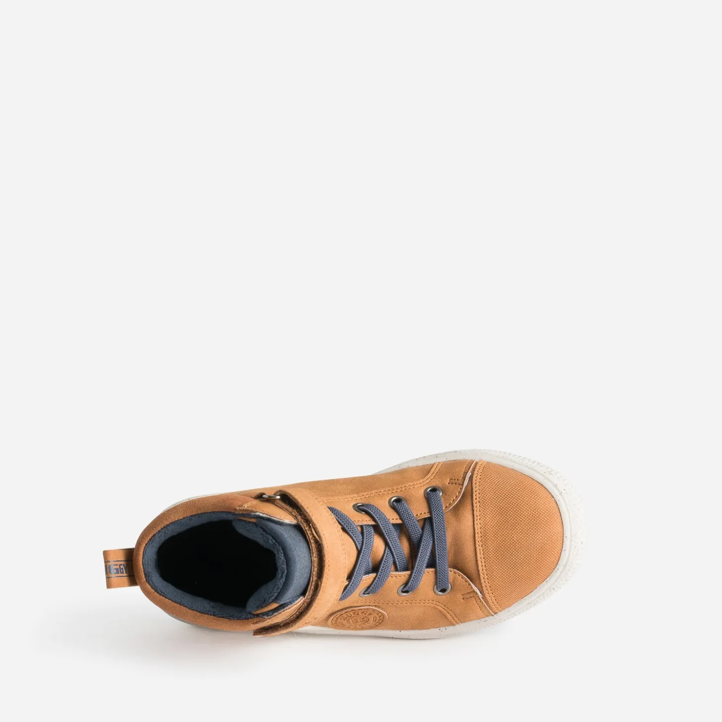 Le rêve d’un enfant, c’est une basket stylée, confortable, qui s’enfile facilement. En matière synthétique, elle se décline en coloris camel, rythmée de découpes écrues et bleu marine. Elle se ferme par un lacet élastiqué et par un scratch. Zoom sur la semelle tachetée et crantée, pour une meilleure adhérence. Sweat, jeans, c’est l’allié de toutes ses tenues du quotidien.