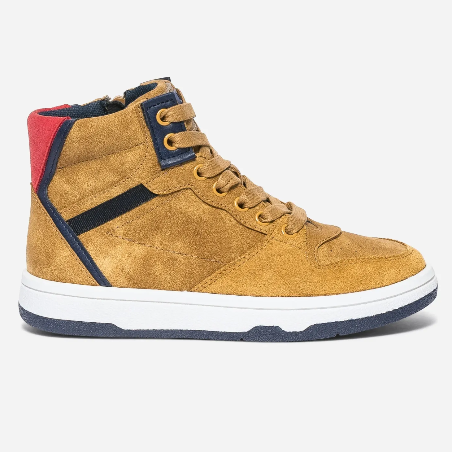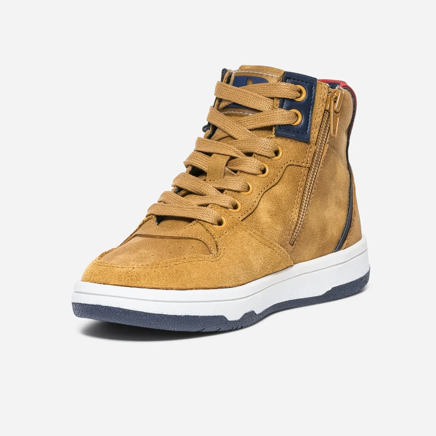 Coup de cœur immédiat pour cette nouvelle basket pour garçon. Coloris camel, elle est conçue en matière synthétique suédée, rythmée, ici et là, de touches bleu marine et rouges. Le lacet est doublé d’un zip intérieur, pour ne pas perdre de temps à se chausser.