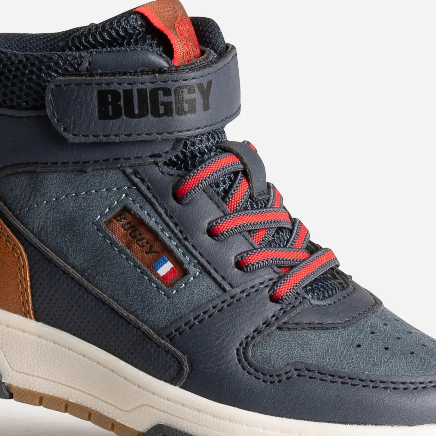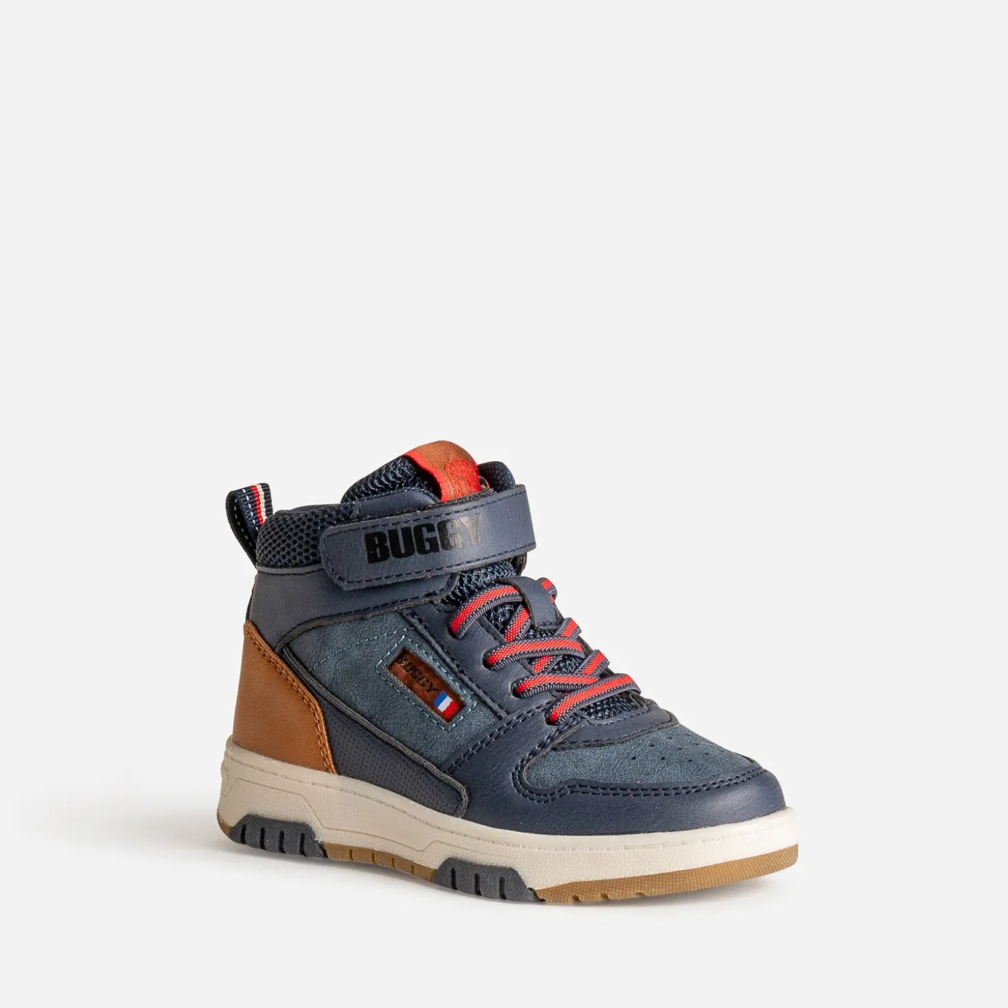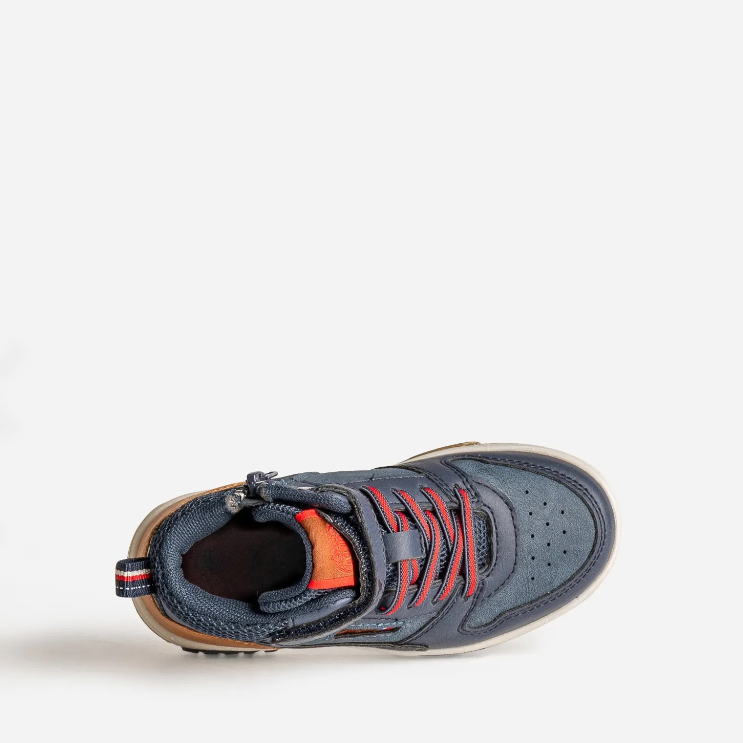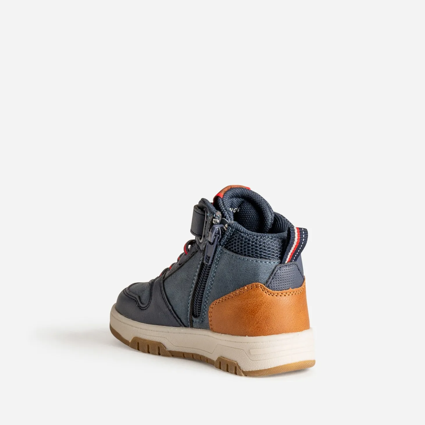 La basket connaît peu de concurrence quand il faut être confort et stylé. En matière synthétique bleu marine, elle multiplie les découpes et s’associe d’une part au mesh, d’autre part au camel et au rouge, pour affirmer son look. Lacet élastiqué, scratch et zip intérieur garantissent un maintien optimal du pied. Un modèle à porter avec un sweat à capuche oversize camel ou rouge sur un jean slim brut.
