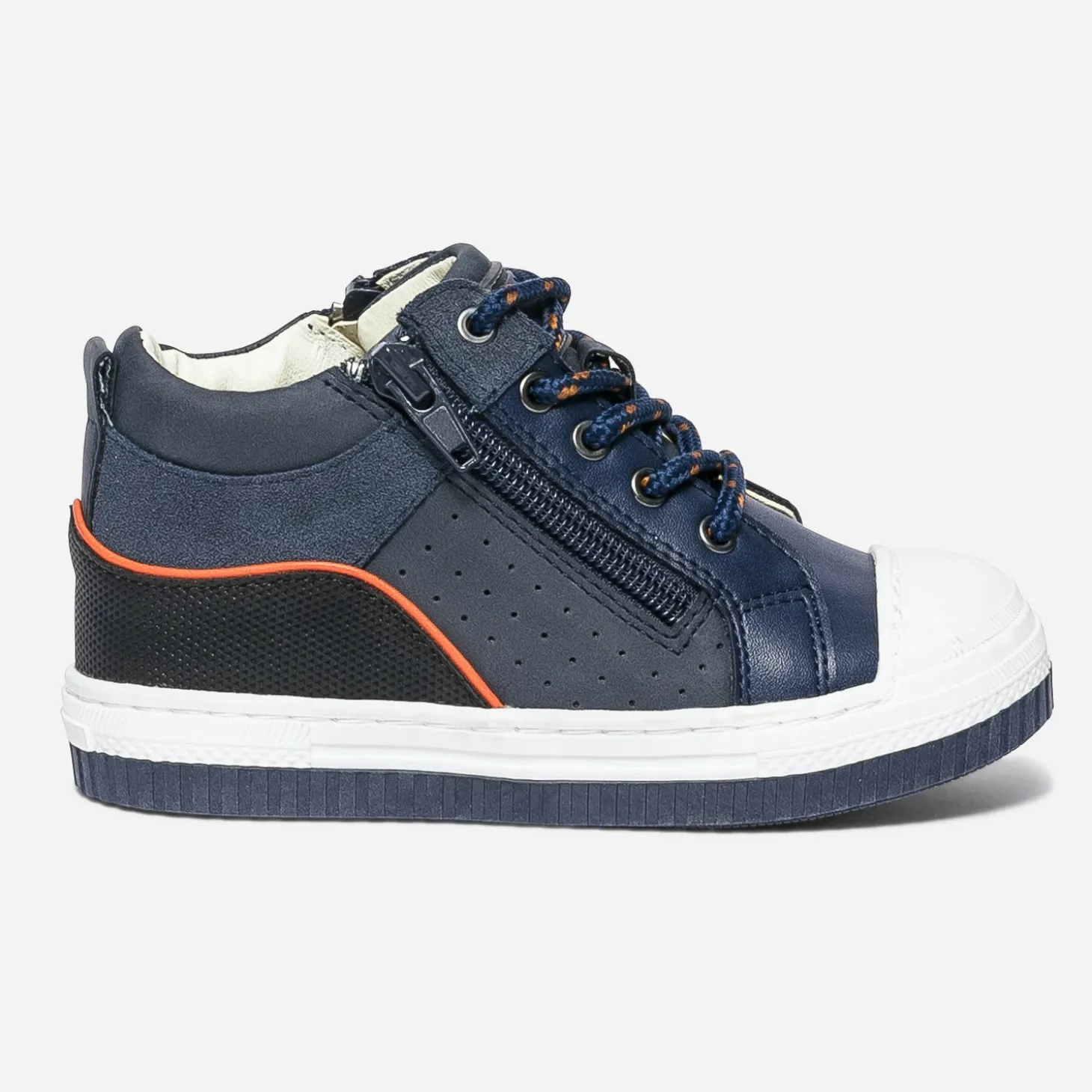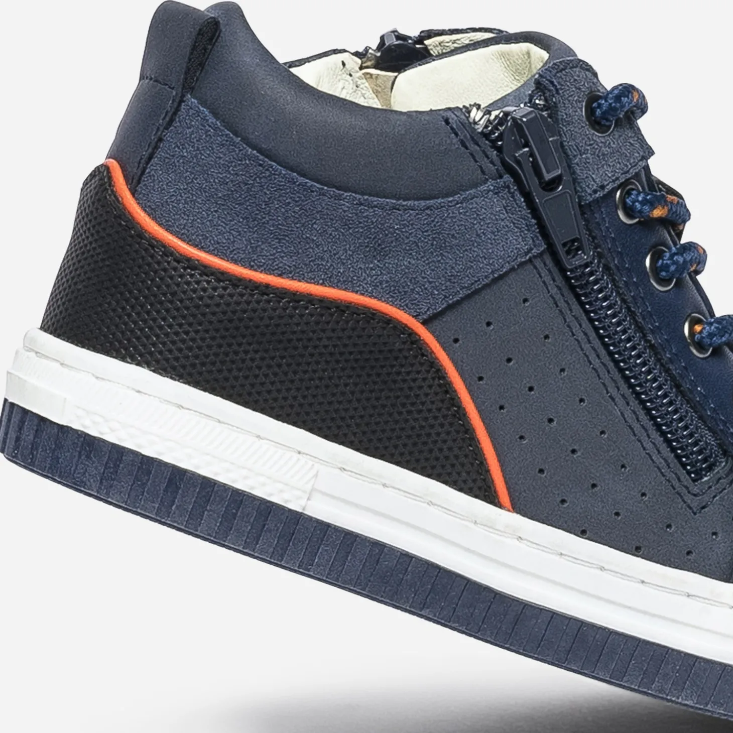 Marcher, courir, sauter, lancer le ballon. Cette basket mi-haute pour garçon est faite pour ça, rien que pour ça. Pour l’accompagner au quotidien, par une matière synthétique facile d’entretien, par un coloris bleu marine souligné d’orange, par un lacet et un double zip, pour simplifier l’entrée et la sortie du pied. Mix matières et bouts renforcés ajoutent une bonne note à l’originalité.