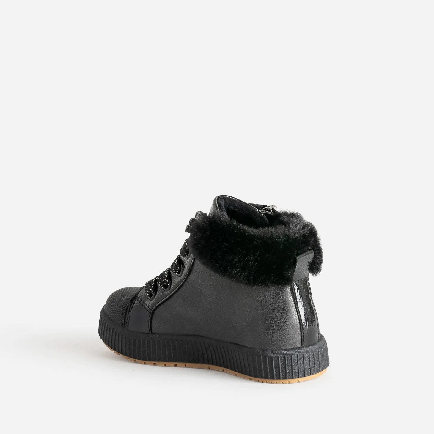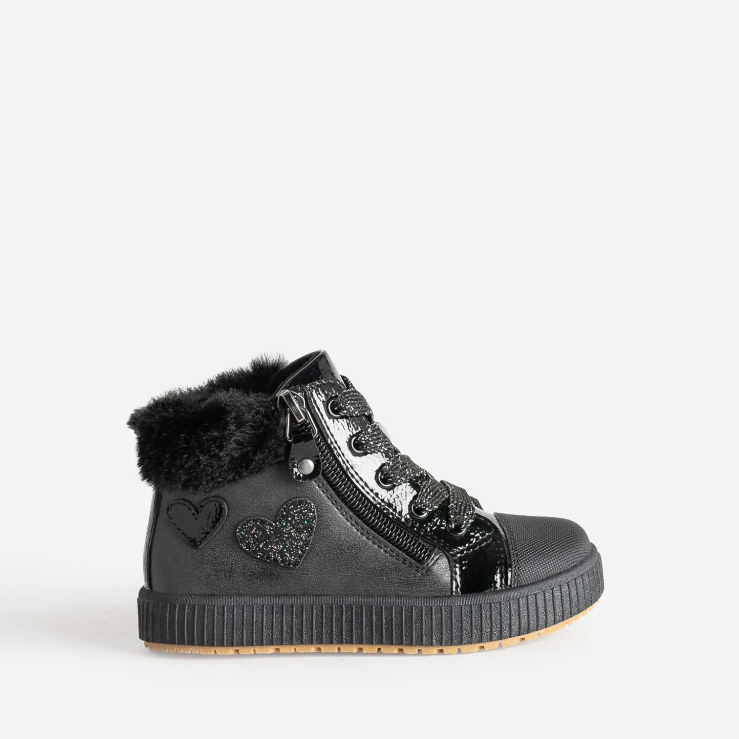 Affinez son style sporty rock, avec cette basket pour petite fille. En matières synthétiques noires, elle allie finitions mates et vernies, dans une belle harmonie. Cœurs sur le côté, bout renforcé, matière fourrée à la cheville : les détails sont particulièrement soignés. Elle se ferme par un lacet pailleté, doublé d’un zip latéral. Un modèle à jouer avec son jogging préféré, ou une robe-pull en molleton gris.