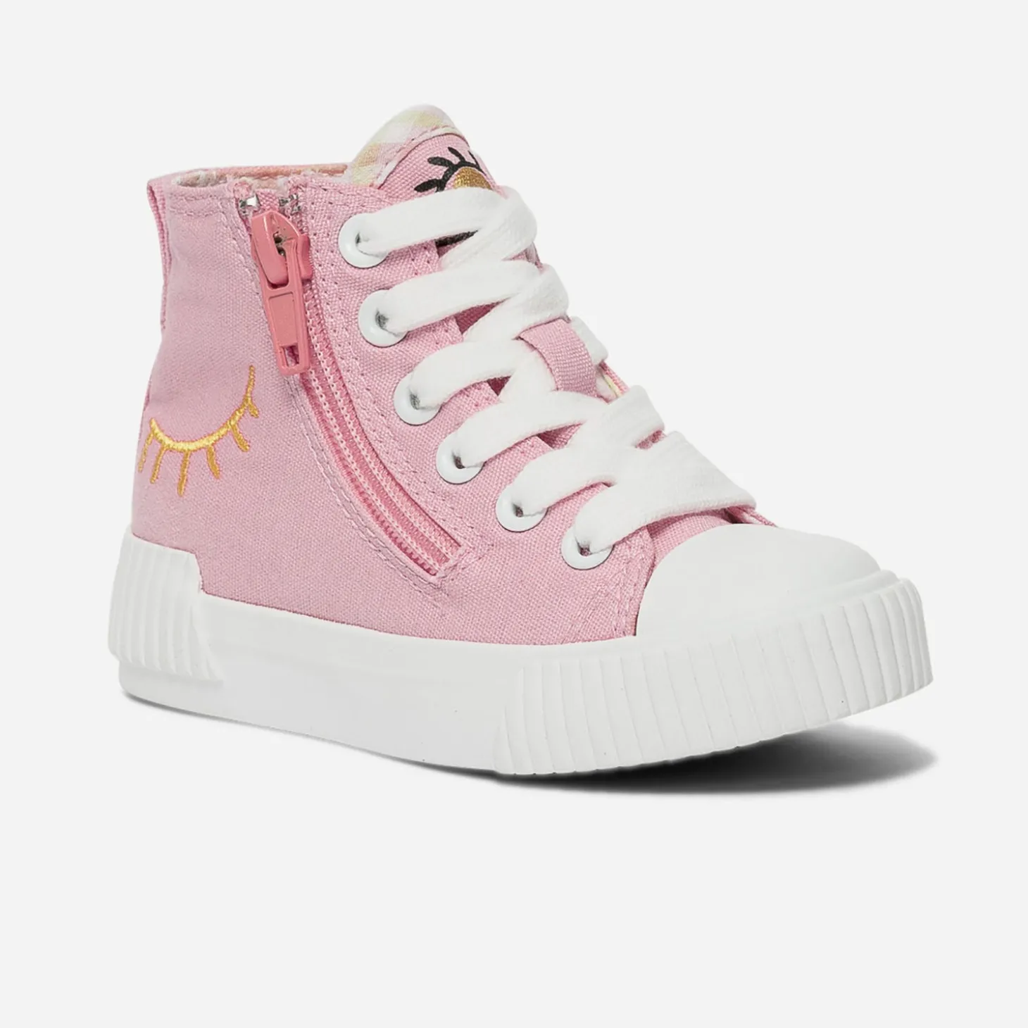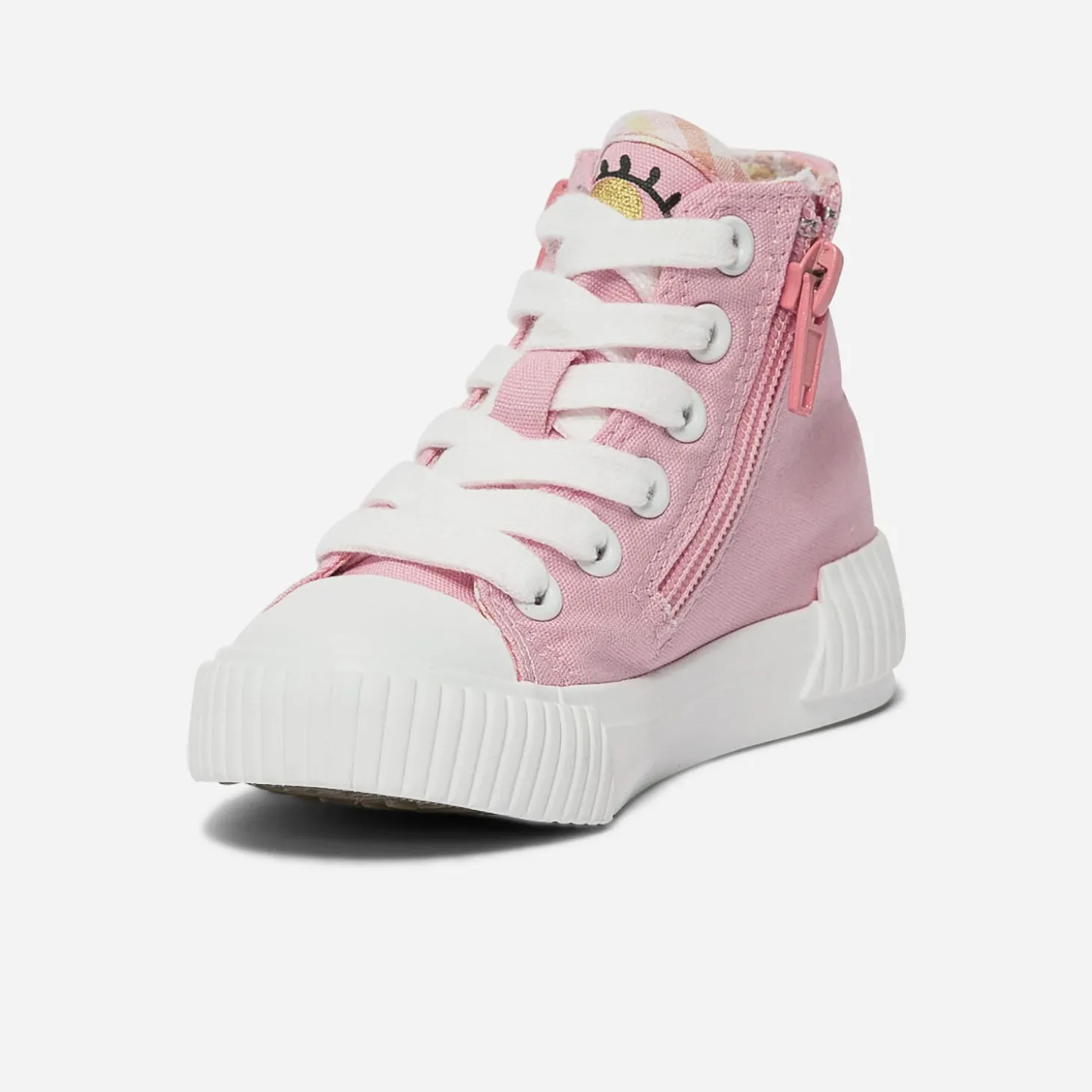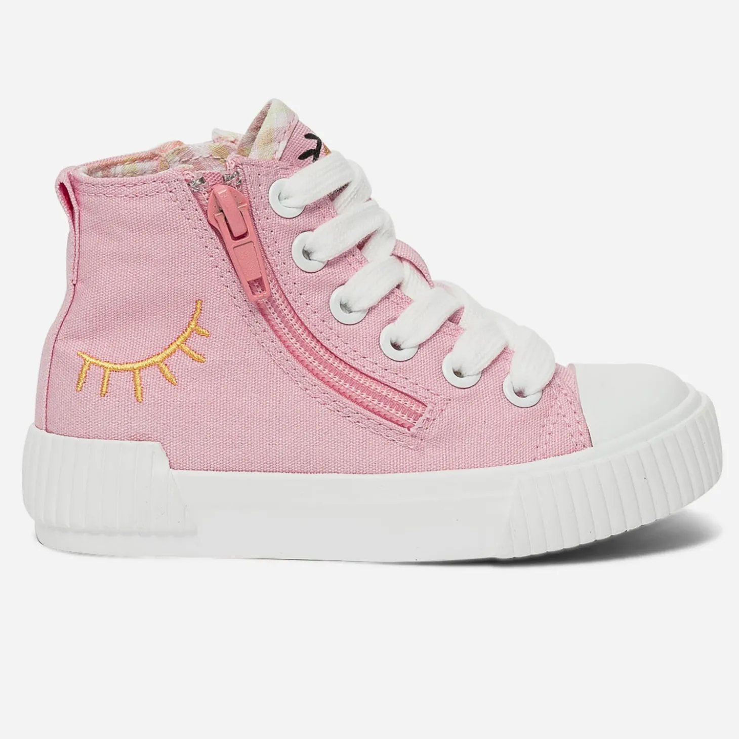 Après le boots, avant la sandale, optez pour la tennis en toile. Rose, elle est décorée d’un œil ouvert imprimé sur la languette, d’un œil fermé brodé sur le côté. Le bout est renforcé, la doublure imprimée vichy dans les tons pastel et elle se ferme par un lacet, doublé d’un zip intérieur. Un modèle pensé pour faciliter l’autonomie et ne pas perdre une minute de jeu !