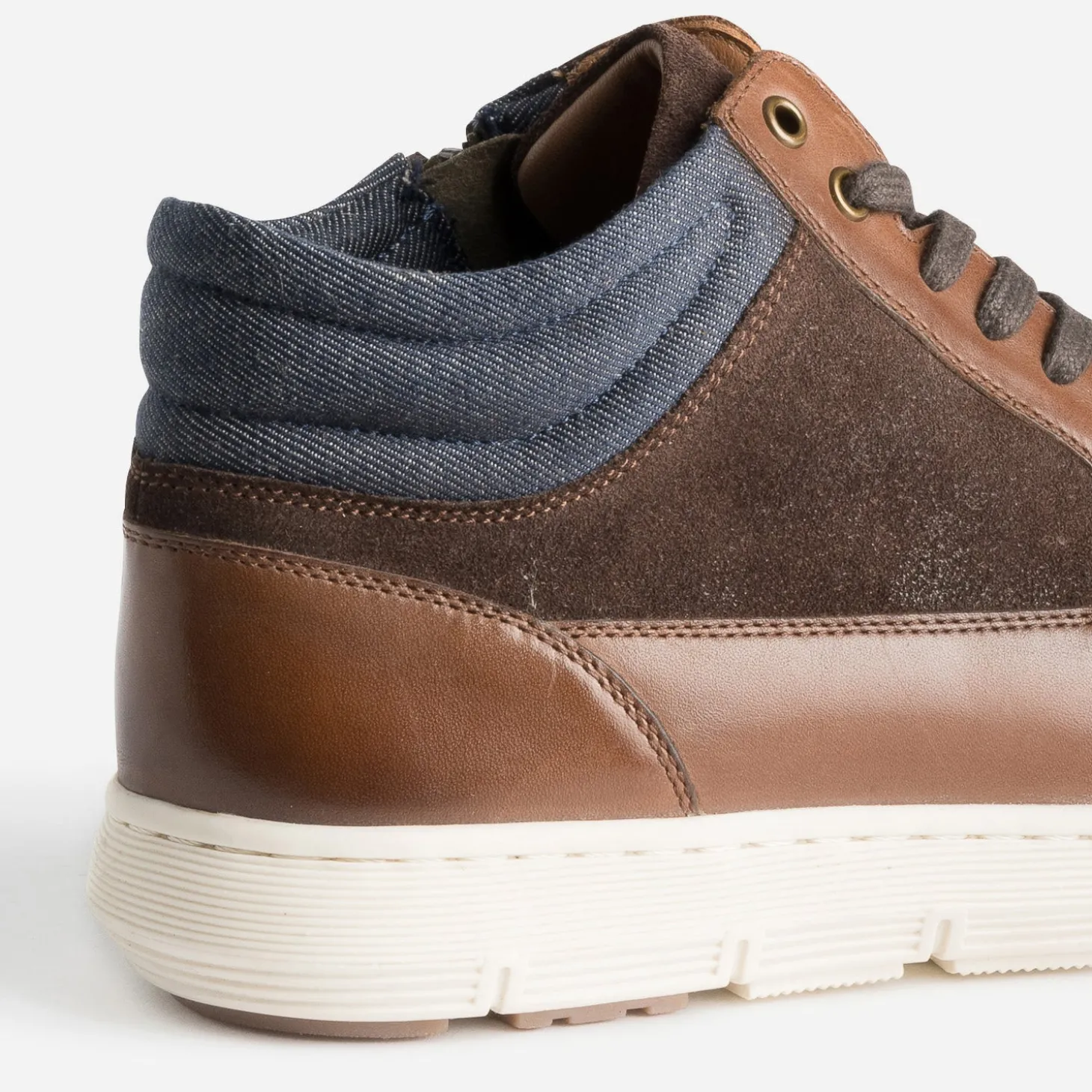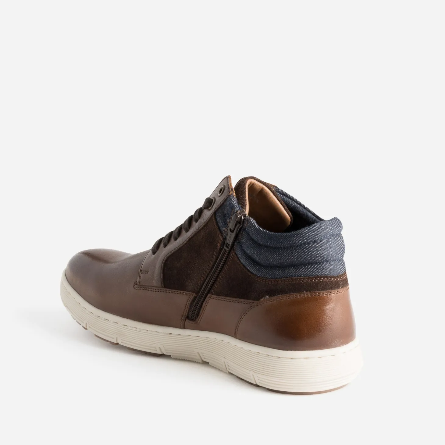 A mi-chemin entre la forme basket et la forme boots, ce modèle homme est un incontournable du moment. En cuir cognac, il est rehaussé d’empiècements en cuir velours marron sur les côtés et en textile marine sur le haut de la tige. Il se ferme par lacet et zip intérieur, pour faciliter l’entrée et la sortie du pied. Pull ou veste, jeans ou pantalon chino, composez un look décontracté, facile au quotidien.