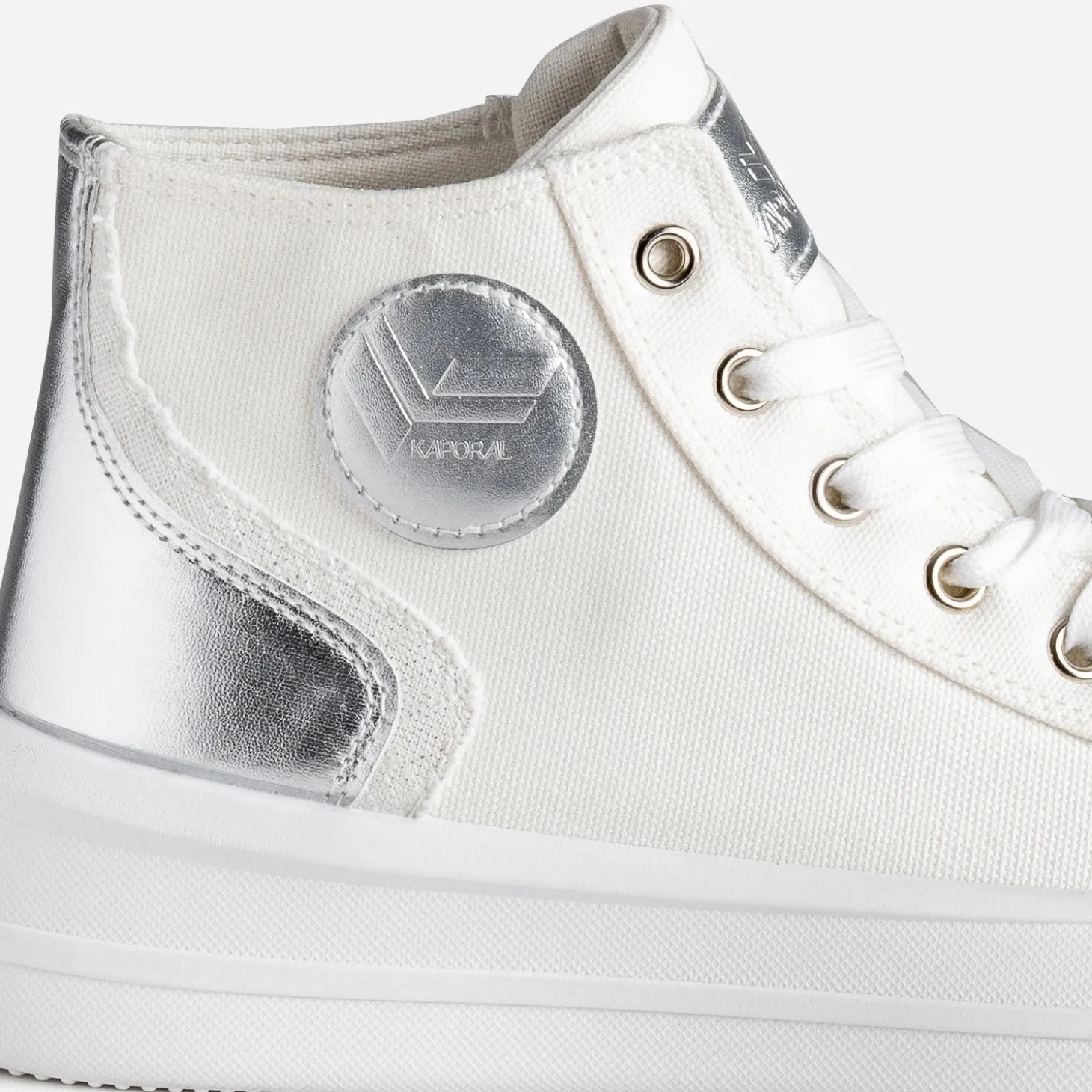 La basket en toile blanche conserve son statut de pièce mode estivale. Elle se démarque par des empiècements contrastés sur le contrefort, l’un métallisé argent, l’autre blanc, légèrement irisé. La semelle, légèrement compensée, apporte de la modernité, et le laçage, un effet monochrome. Imaginez-la avec un combi-short noir, avec un débardeur blanc et un jean cropped gris, avec une robe longue tube kaki.