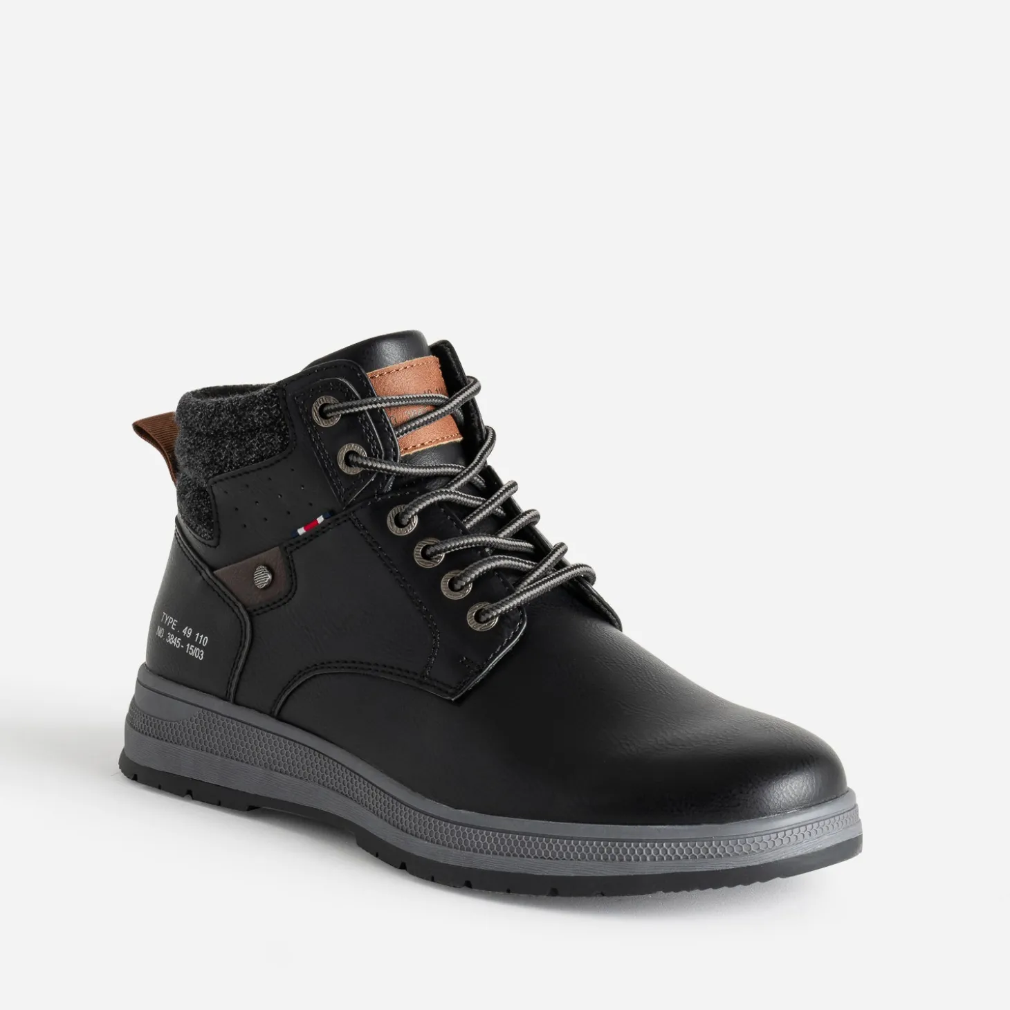 Boots ou basket ? Leur point commun, c’est leur tige montante. En matière synthétique noire, elle est finalisée par une tige en textile gris chiné matelassé et se ferme par un lacet esprit cordon. Un modèle à jouer avec un look esprit worker, composé de pièces en denim, plus ou moins délavées.