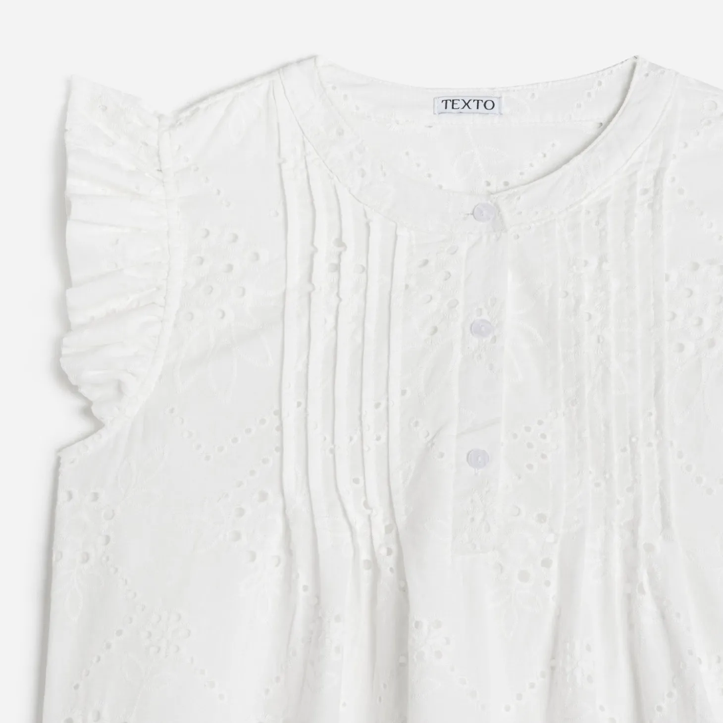 Forme droite, col rond, sans manches, volants aux emmanchures, plis cousus devant, fermeture par boutons.
