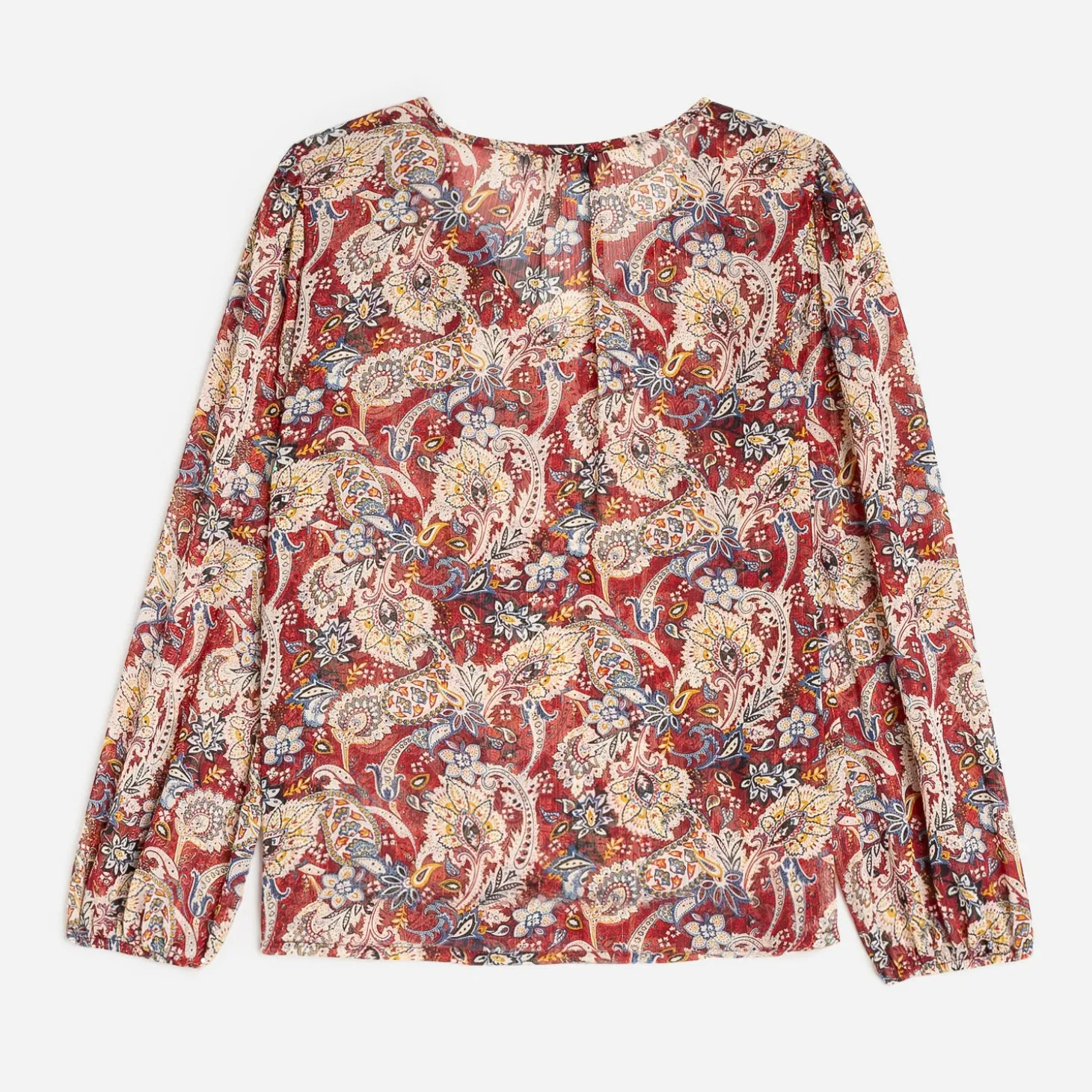 Une jolie blouse imprimée, c’est l’assurance d’un look facile à porter. En voile rouge, elle se démarque par son imprimé cachemire floral, rehaussé de fines rayures dorées.