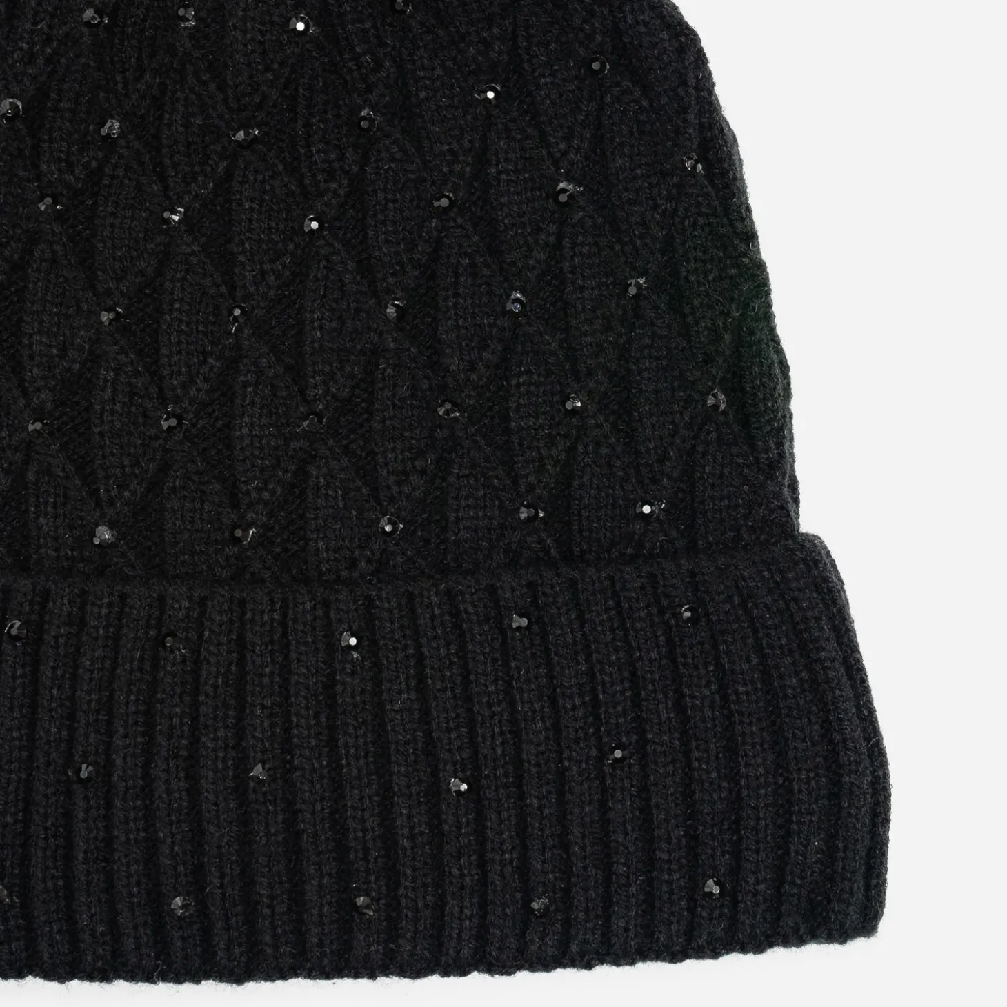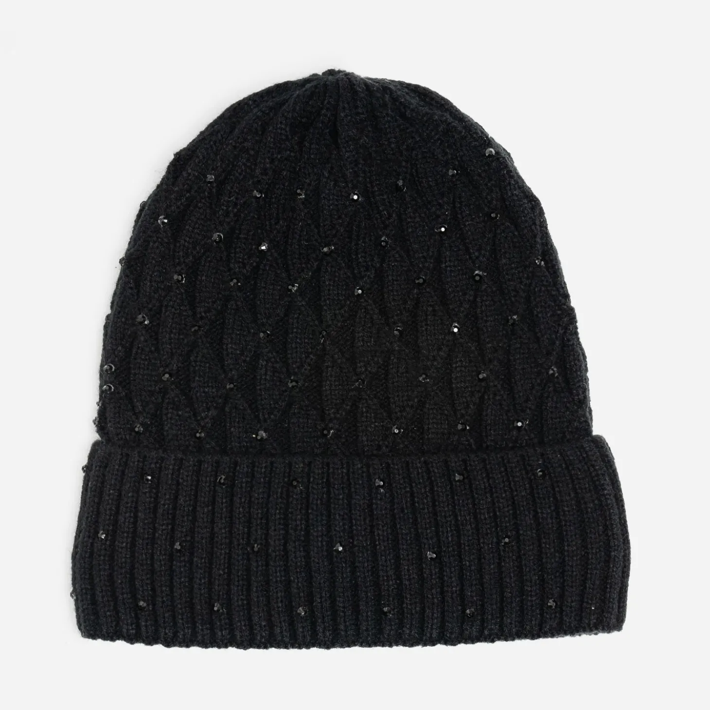 Jeux de points fantaisie, revers à bord-côtes, décor strass ton sur ton, rien que du noir pour ce bonnet en tricot pour femme. Il est doublé pour réchauffer la tête instantanément. Un accessoire indispensable pour finaliser les looks d’hiver d’une touche de chic.