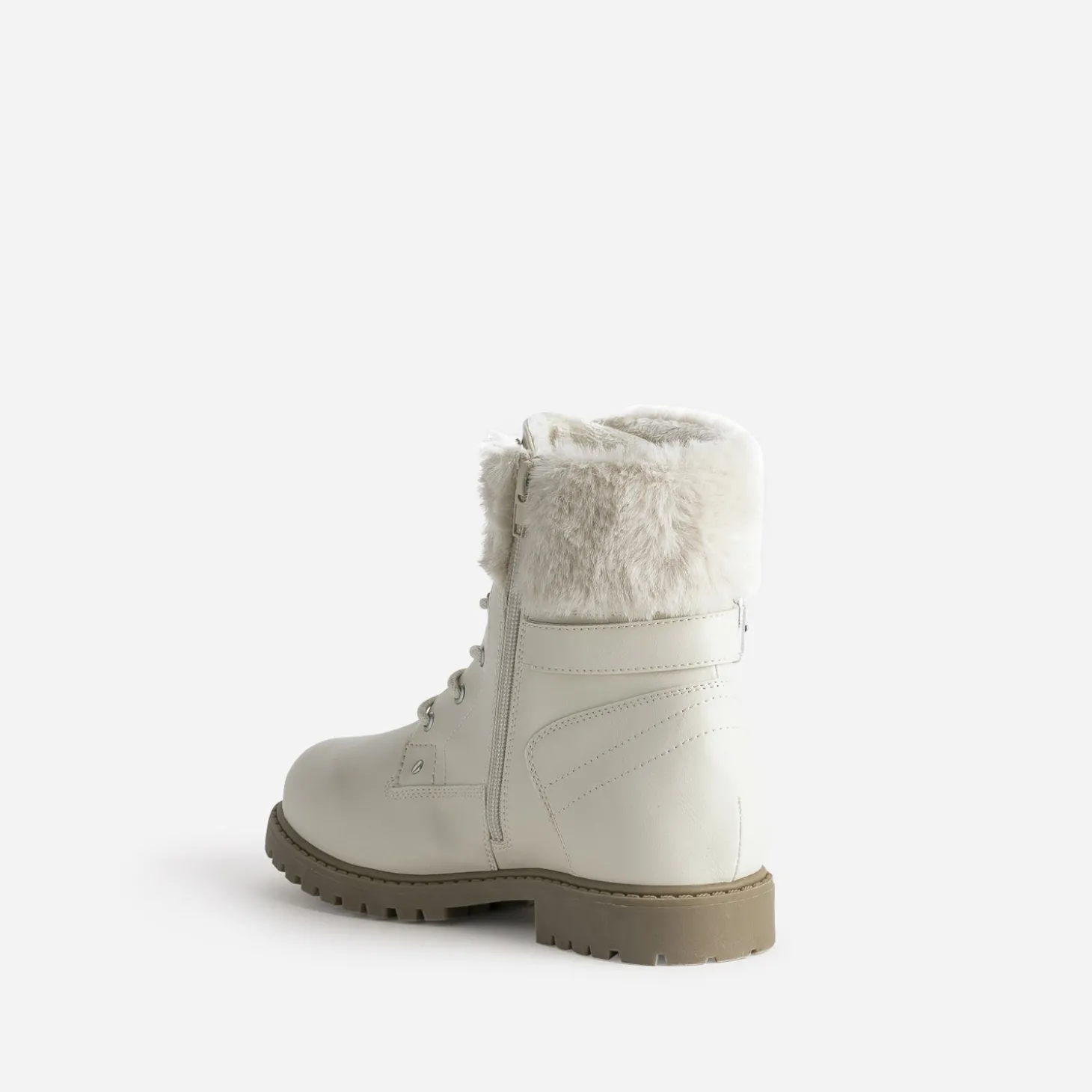 Qu’importe les prévisions météo pour cet hiver, le boots pour junior fille concilie confort, chaleur et style, sans compromis. En matière synthétique lisse, il se décline en coloris beige, avec doublure ton sur ton entièrement fourrée. Appréciez sa fermeture par lacet, doublée d’un zip intérieur, pour faciliter l’entrée et la sortie du pied, et ainsi gagner quelques précieuses minutes. Monté sur une semelle crantée, il promet une adhérence parfaite au sol. Un modèle à imaginer avec une robe pull à col roulé en tricot côtelé et des collants, dans les tons naturels.