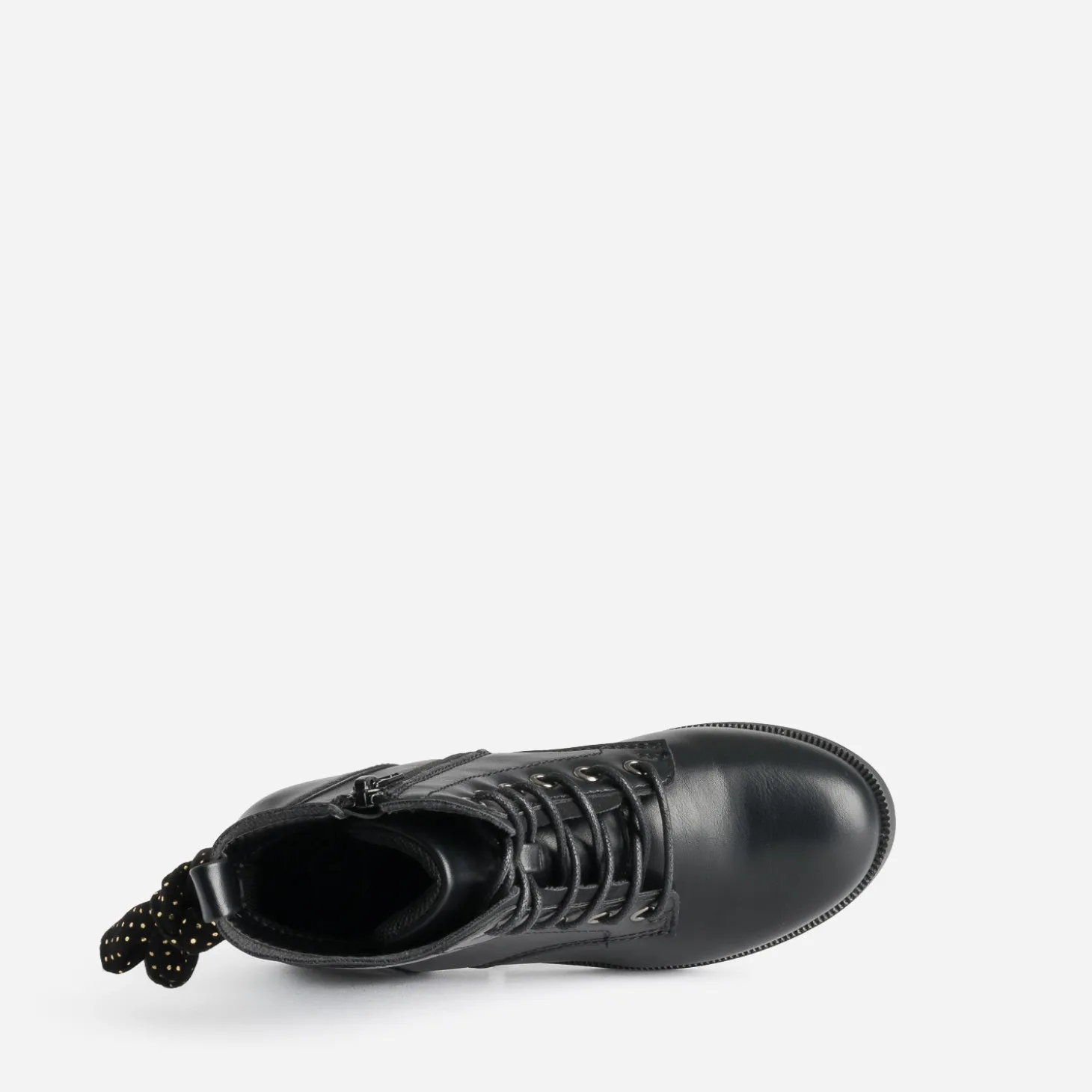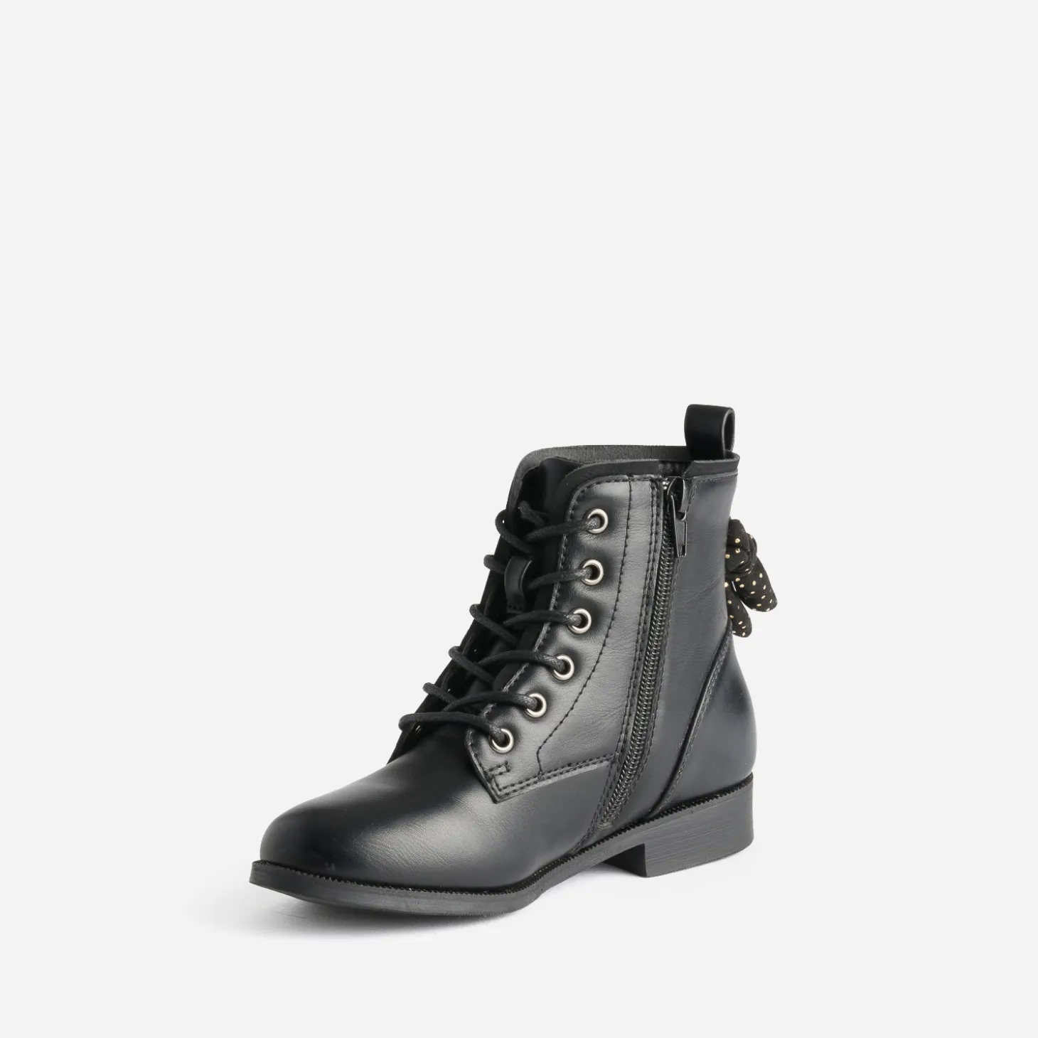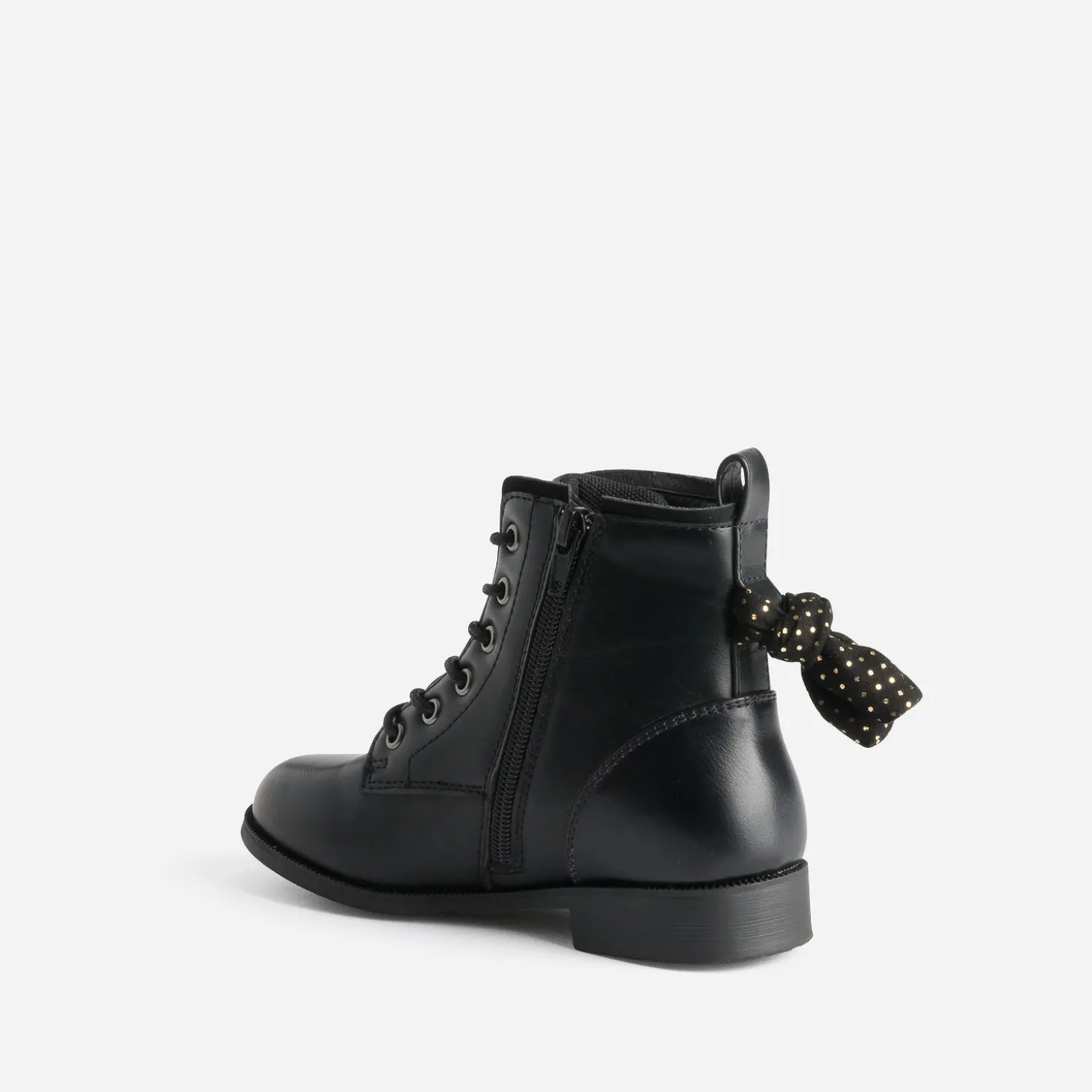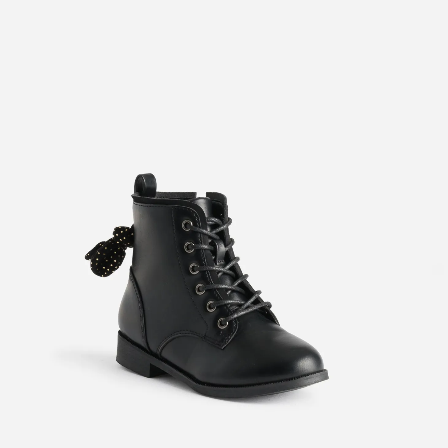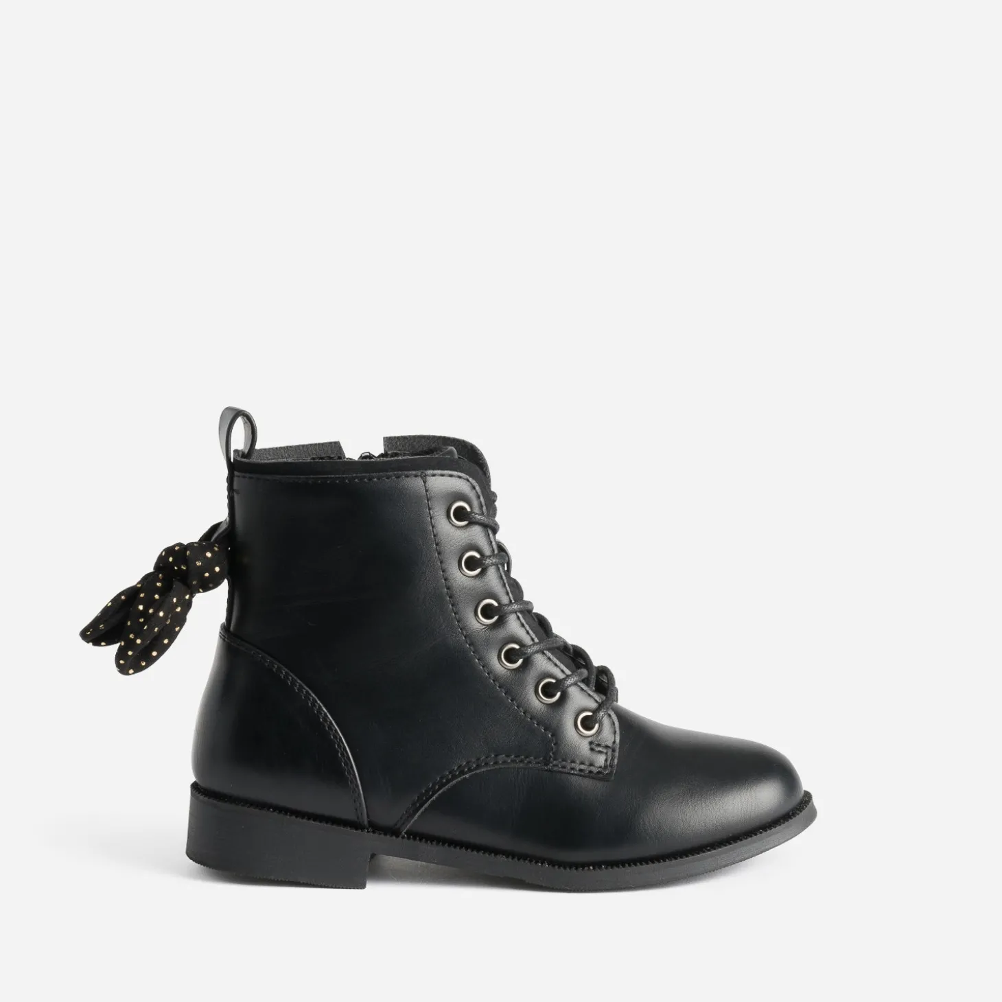 Et si on vous proposait un modèle mode et intemporel, qui s’accorde aussi bien avec les jeans qu’avec les robes ? Ce boots pour fille est une valeur sûre. En matière synthétique noire, il se ferme par un lacet et un zip intérieur et se démarque par un petit nœud noir, à pois dorés, placé à l’arrière de la tige.