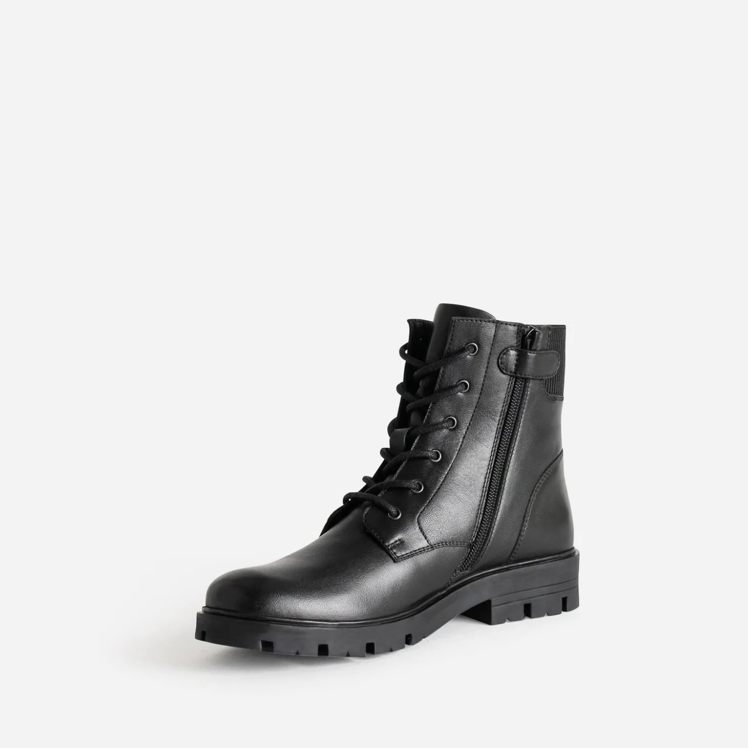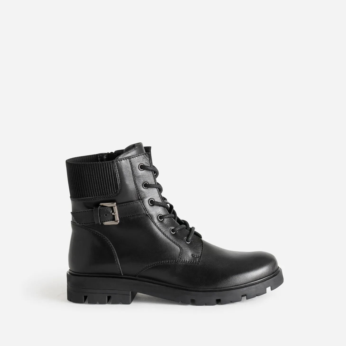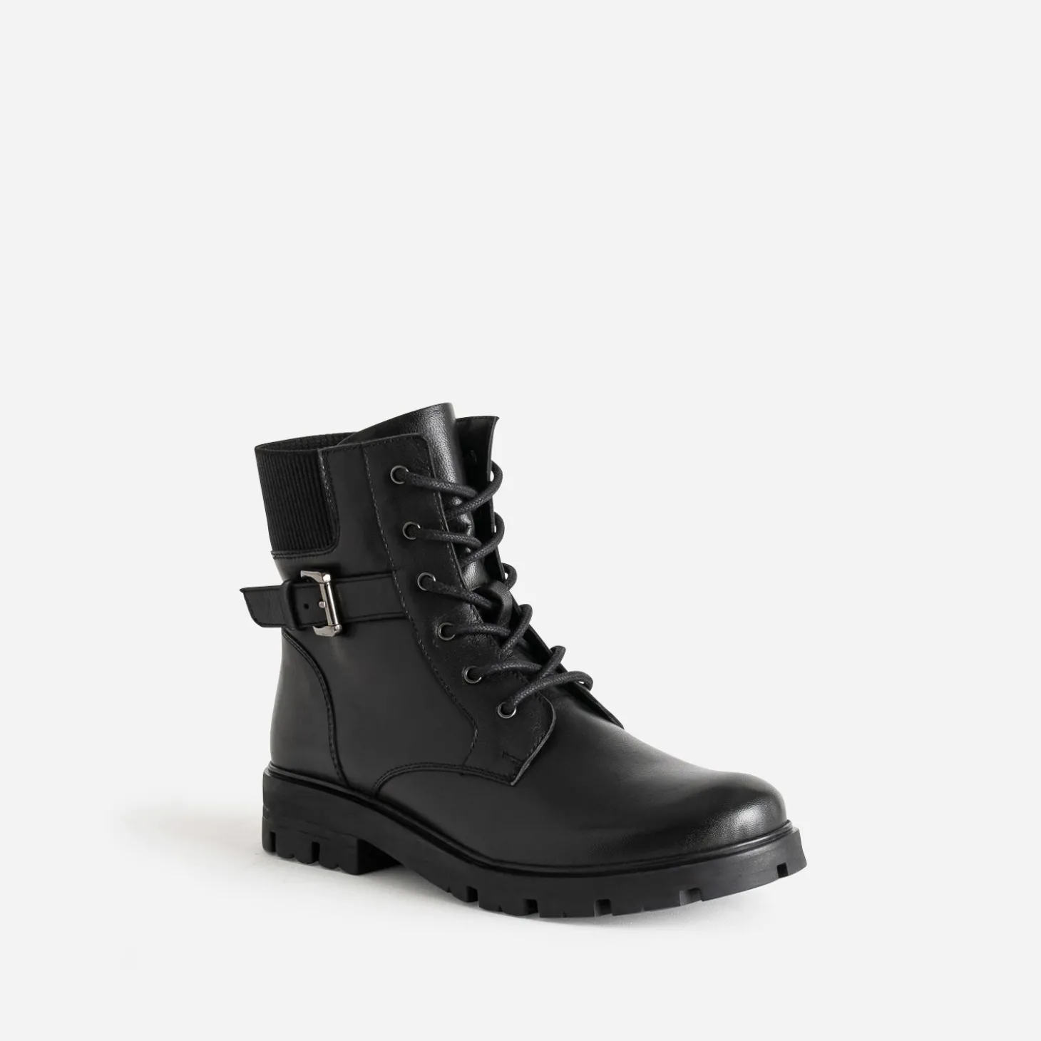 Celui qui traverse les hivers sans se démoder, c’est le boots à lacet. En cuir noir, il se démarque par une boucle décorative et un empiècement élastiqué sur le haut de la tige : tige fermée par un lacet et un zip intérieur. La semelle crantée promet une meilleure adhérence au sol. Un modèle iconique, inspiré du style militaire, à l’aise avec une robe longue ou un look plus rock.