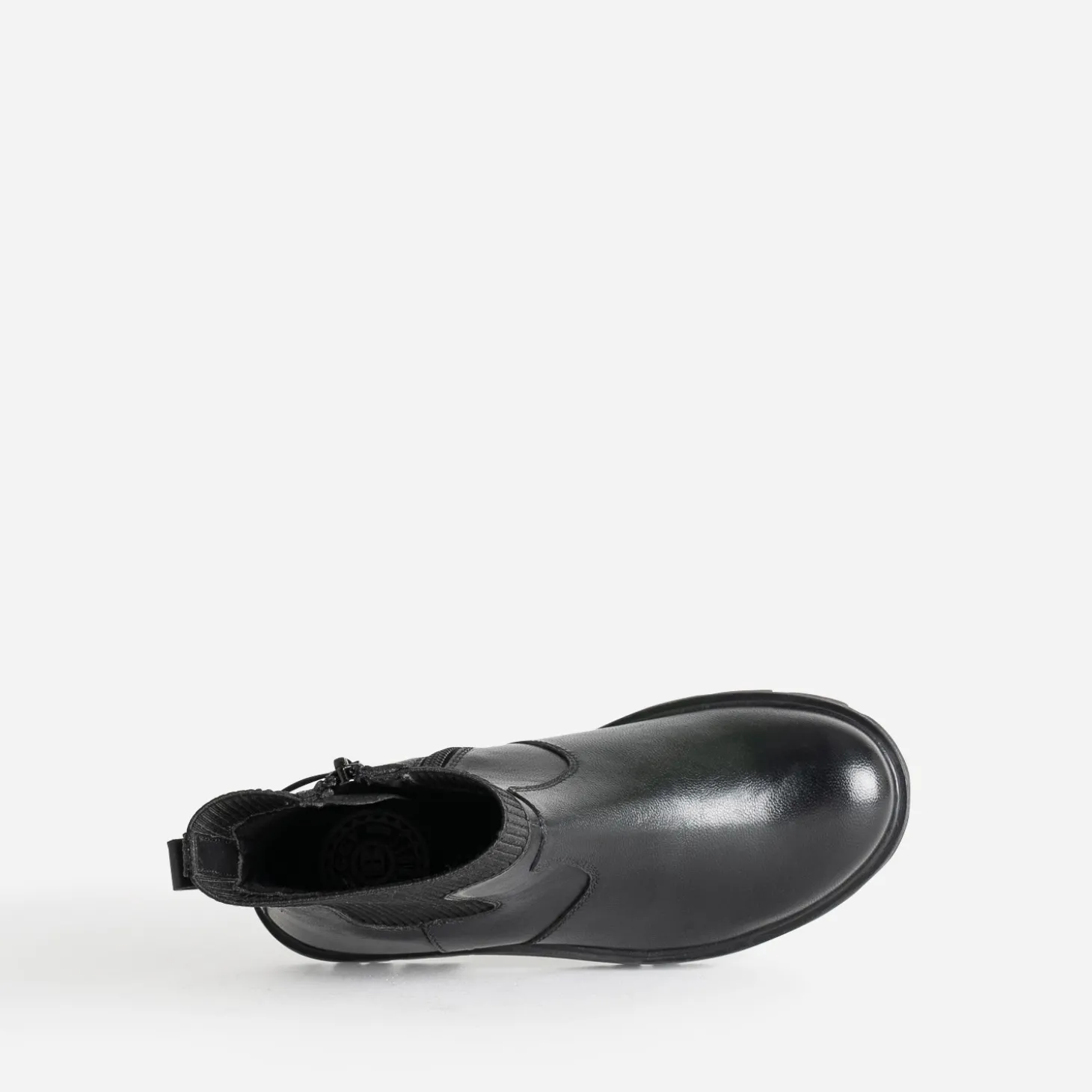 Allure boots par sa tige montante, esprit Chelsea par son empiècement élastiqué. Un modèle hybride directement inspiré du style rock. En cuir lisse noir, il chausse les petites filles aussi bien avec un pantalon qu’avec une robe.