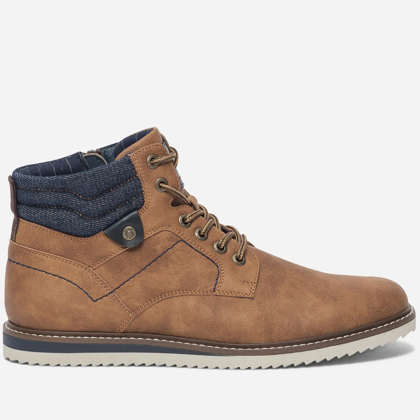 Semelle crantée et tige montante, col matelassé et lacet esprit cordon, le boots homme se prépare à affronter l’hiver, en s’inspirant des montagnards. En matière synthétique camel, il présente un empiècement en textile marine esprit denim et une doublure imprimée à rayures tennis. La fermeture par lacet est renforcé par un zip intérieur. Un modèle à imaginer par grand froid, avec pull à col roulé, jean et parka. Vivement l’hiver !
