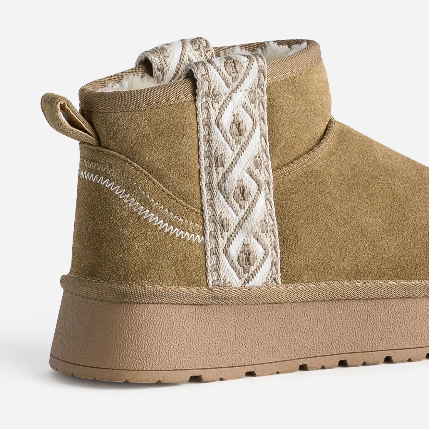Le boots fourré a ses adeptes. Entièrement fourré, il est confectionné en cuir velours et se décline en couleur camel. Il associe une tige semi-montante à une semelle à plateforme ton sur ton. Les côtés sont décorés d’une large galon tissé, dans un esprit ethnique. Un modèle à combiner avec un look blanc d’hiver, avec pull chaussette et jean large à taille haute, le tout écru.