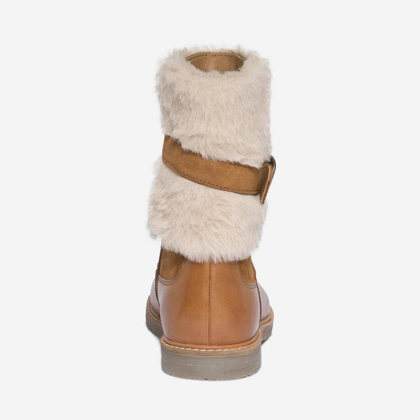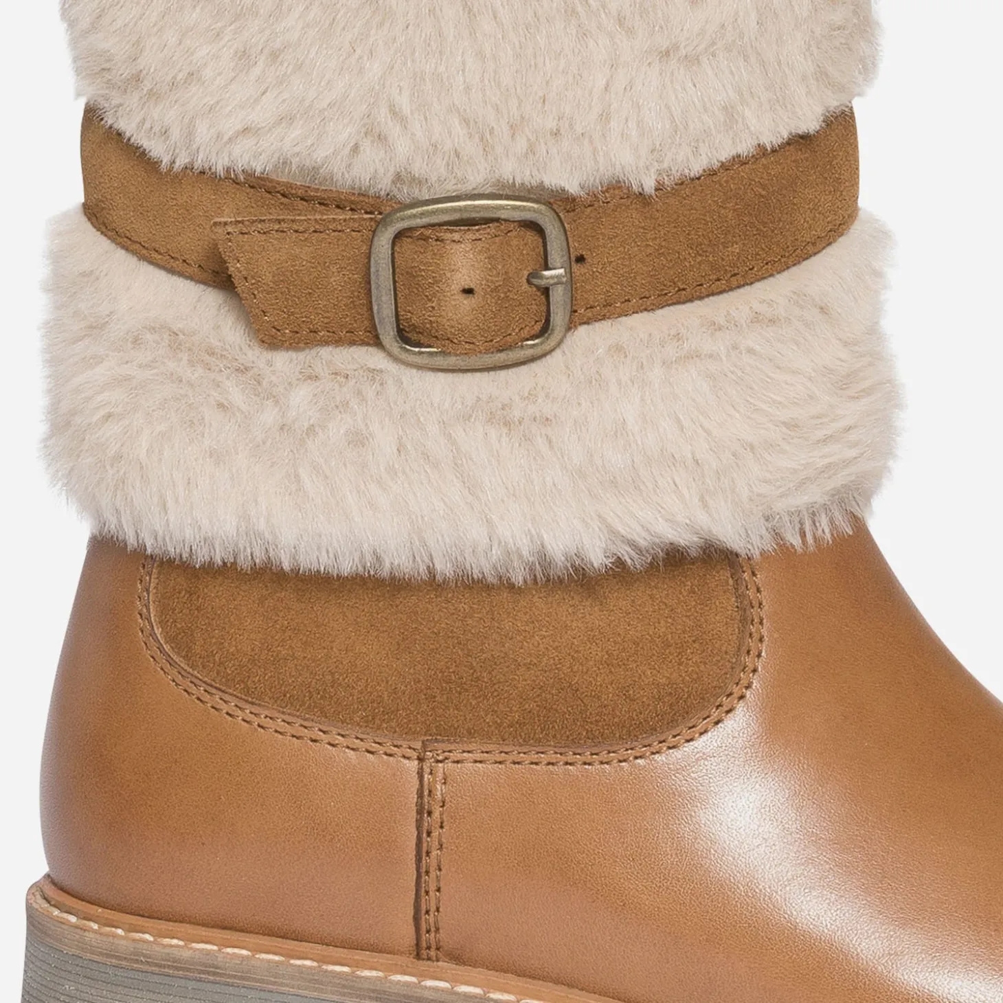 Mix de cuir lisse et de cuir velours, le boots fille camel défend un style élégant et classique. Son atout ? Un empiècement tout doux, en matière synthétique beige, amovible par pressions, à installer à l’approche du plein hiver. Idéal avec les robes, jupes et pantalons, un modèle à porter sans modération.