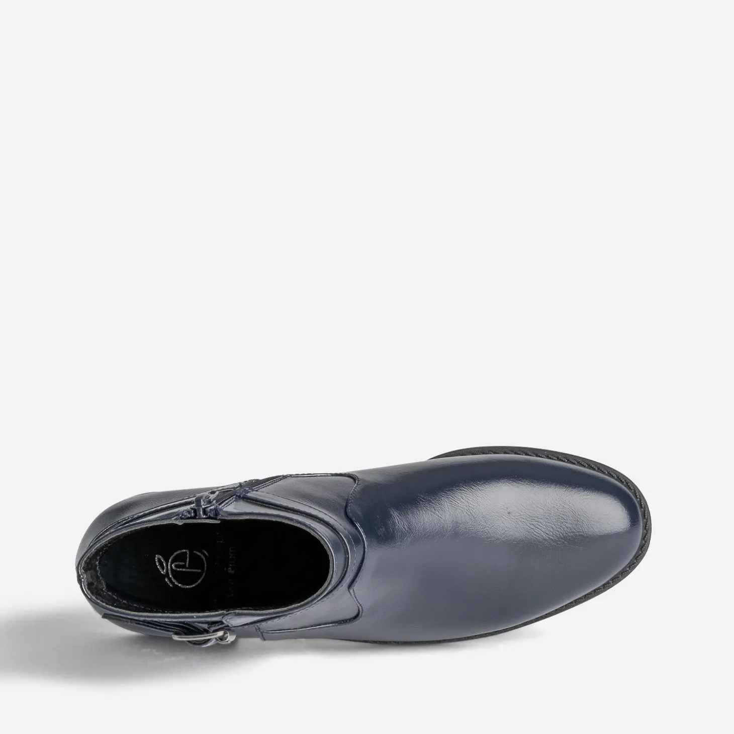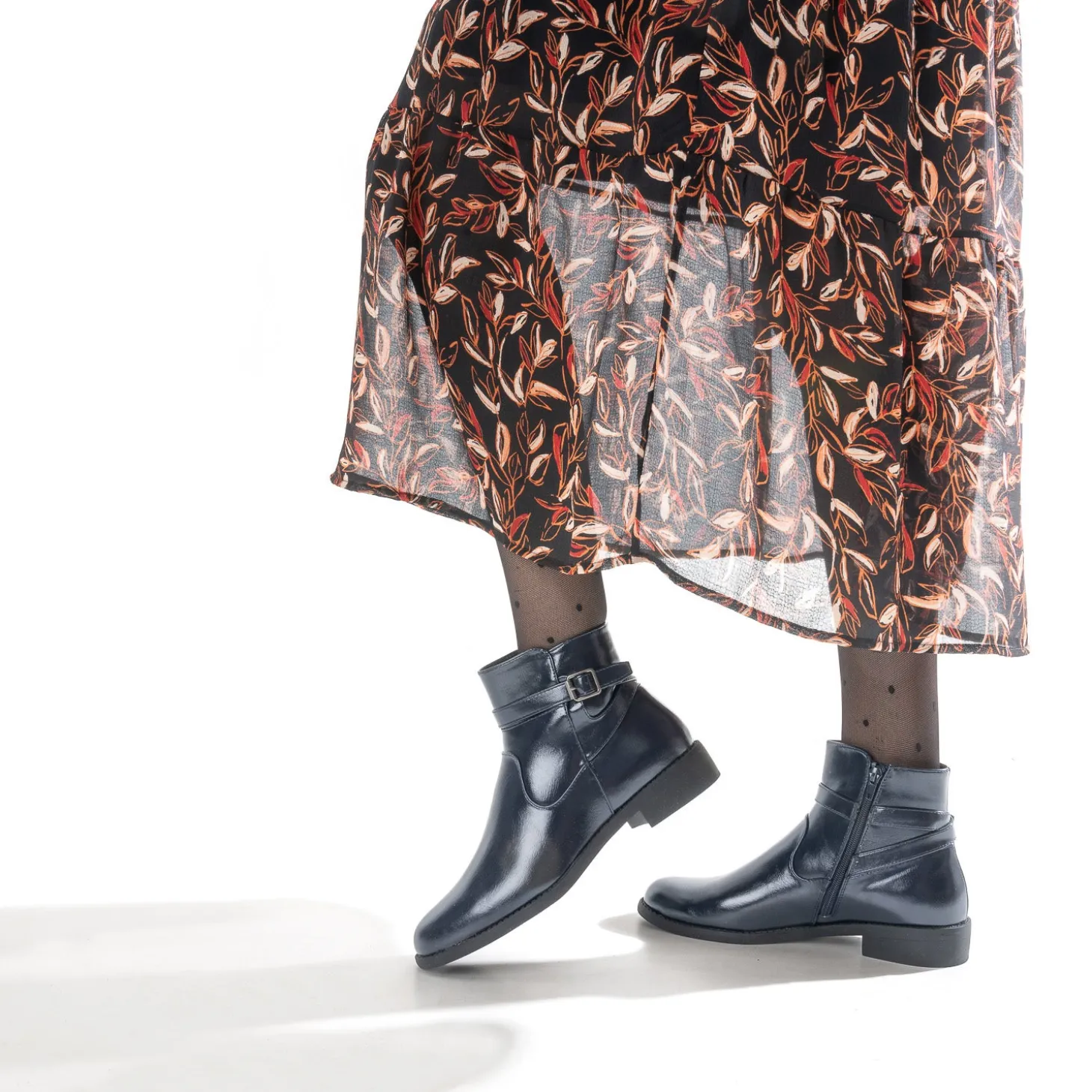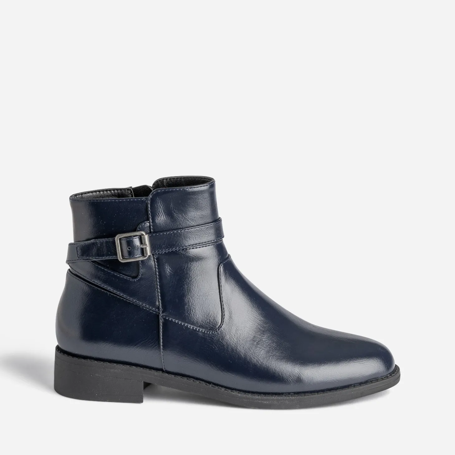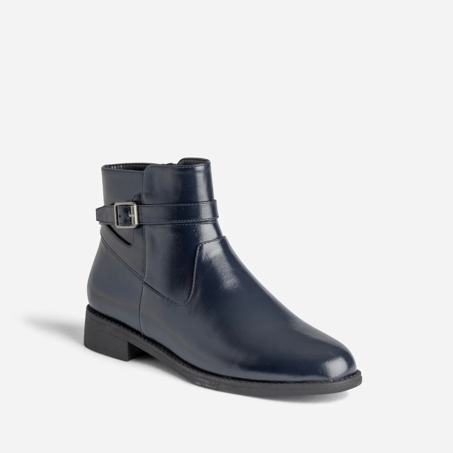 Doté d’une bride autour de la cheville, le boots s’approprie l’esprit jodhpur, lié à l’univers de l’équitation. En matière synthétique lisse, il se décline en coloris marine, pour s’accorder à un maximum de tenues. Talon décroché de 3 cm, bout rond et fermeture par zip intérieur, il reste un essentiel du shoesing féminin. Un modèle à porter avec un look city, chemise blanche et pantalon cigarette bleu marine.