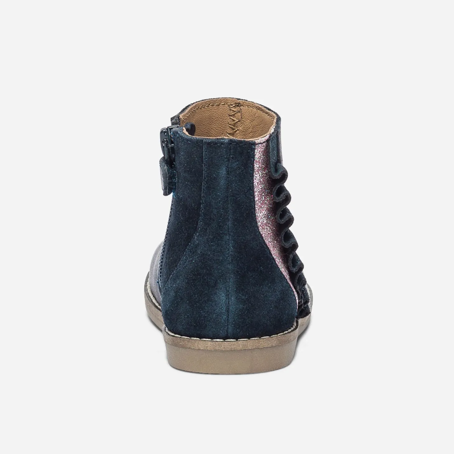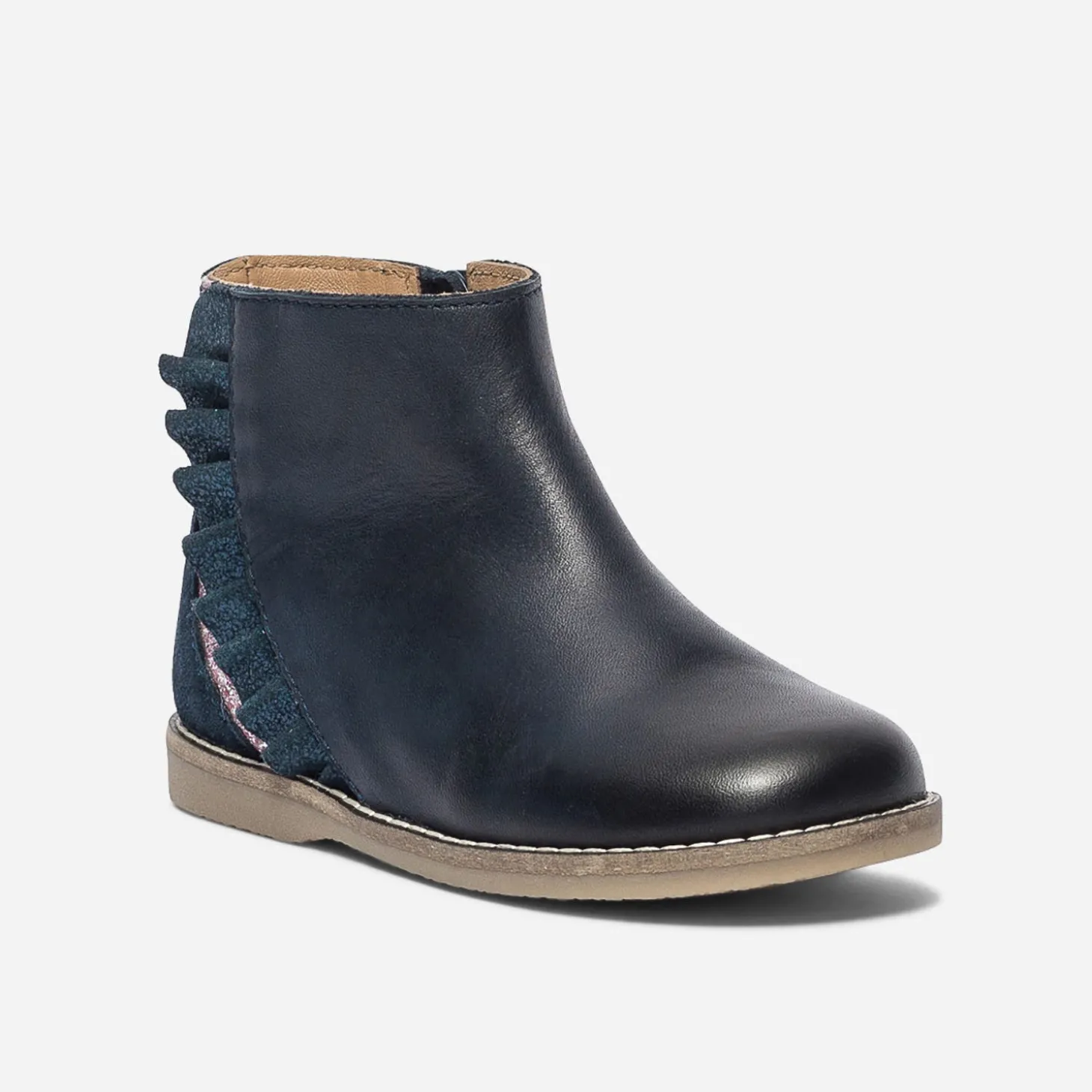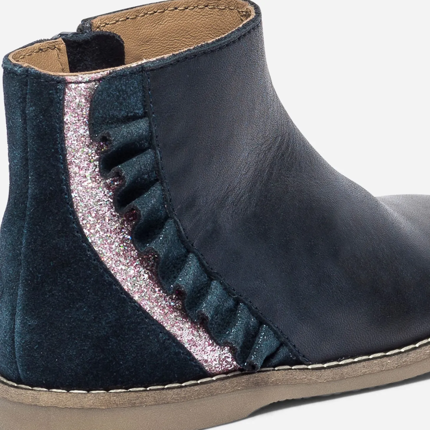 Mettez une touche de romantisme dans les looks d’hiver de votre petite fille. A ses pieds, un boots marine en cuir lisse, souligné à l’arrière, d’un contrefort en cuir velours ton sur ton, d’un empiècement rose pailleté et d’un volant irisé. Peut-être pour courir plus vite et s’envoler ? Un modèle à imaginer avec une doudoune marine, un sweat rose et un jean brut.