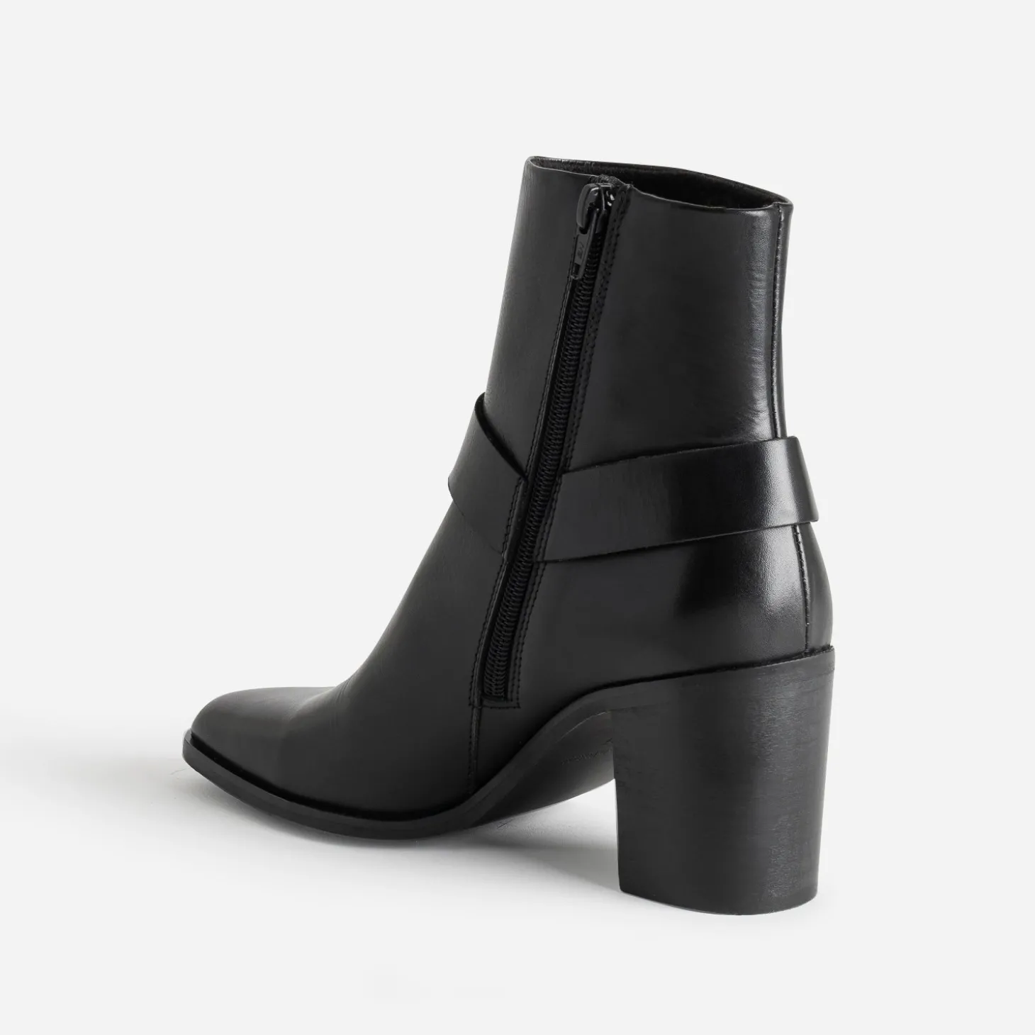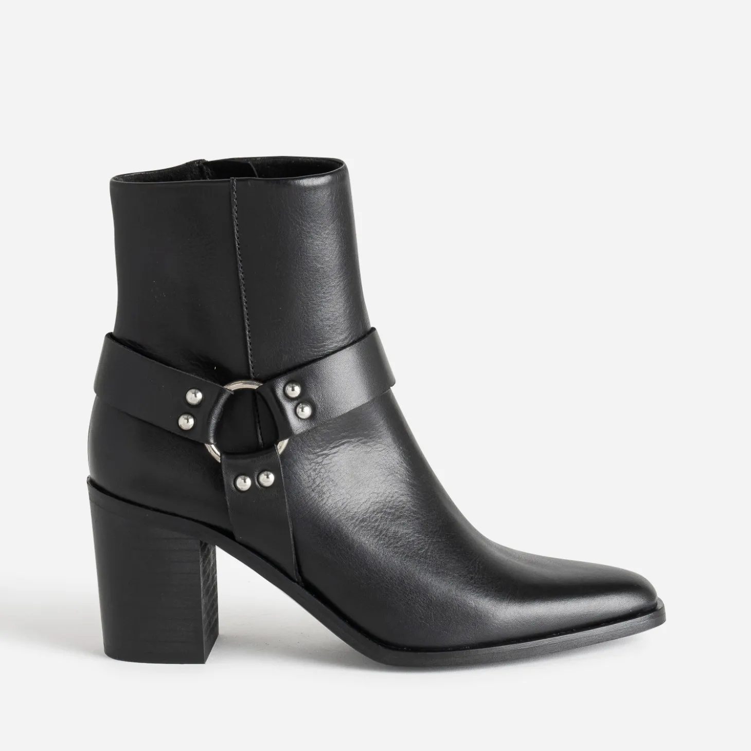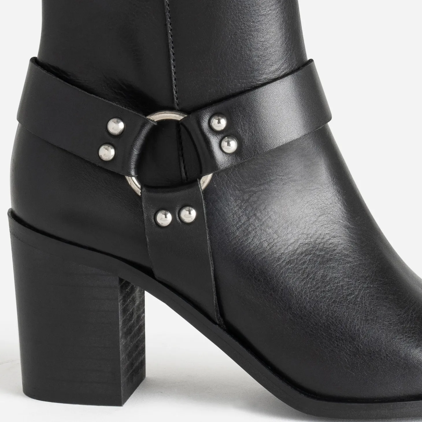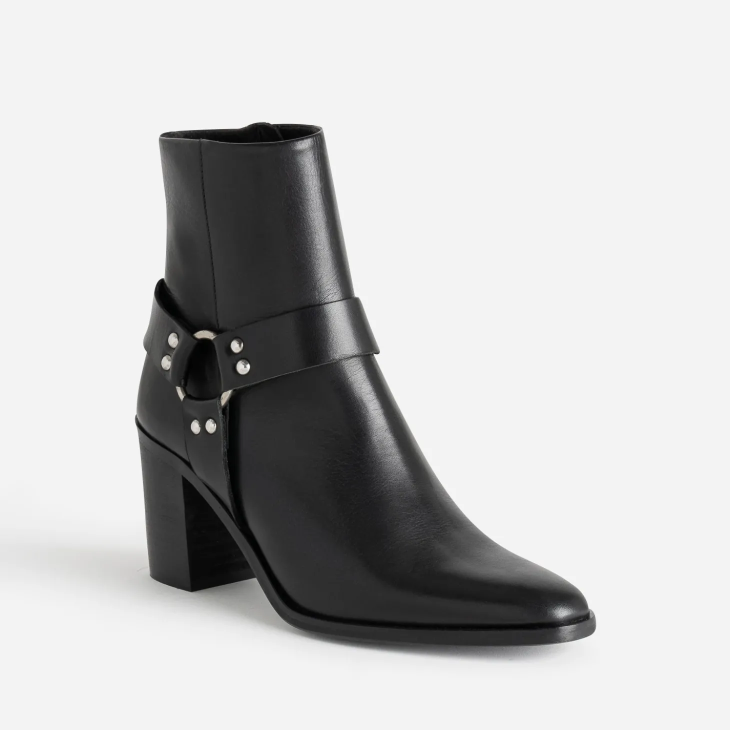 Pas facile de choisir entre l’élégance d’un talon haut et l’esprit motard ? Ce boots femme est LA réponse à toutes vos envies. En cuir noir, il séduit par son bout affiné, son talon carré de 7,5 cm de haut, parfaitement stable, et ses brides sur la cheville, maintenues par des rivets et un anneau en métal. Tout y est. Un modèle qui allonge résolument la silhouette, si vous l’associer à un manteau extra long, tendance majeure de la saison, offrant une silhouette imposante et sophistiquée.