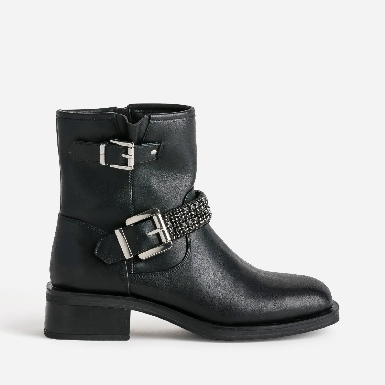 Ne résistez pas à l’appel du style motard. Laissez-vous transporter par son caractère racé, marqué par un bout et un talon carrés. En matière synthétique noire, il ose, le pas de côté, en revisitant la bride avec féminité : un décor de strass facettés ton sur ton. Un modèle à associer avec un tee-shirt gris lamé sous un blazer noir, et un jean slim noir, sans oublier maxi manchette et sac souple sur l’avant bras.