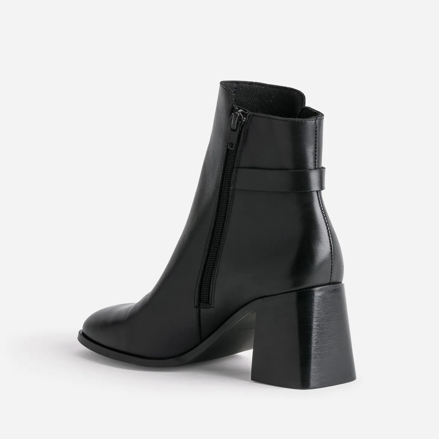 Le boots femme a ce je-ne-sais-quoi d’intemporel et d’élégant, en toutes circonstances. En cuir noir, il est monté sur un talon légèrement flare de 7 cm, présente un bout carré et une tige asymétrique, soulignée d’une bride arrière avec un anneau en D. En costume-pantalon ou en robe fluide, il affectionne le style masculin-féminin, sans pareil.