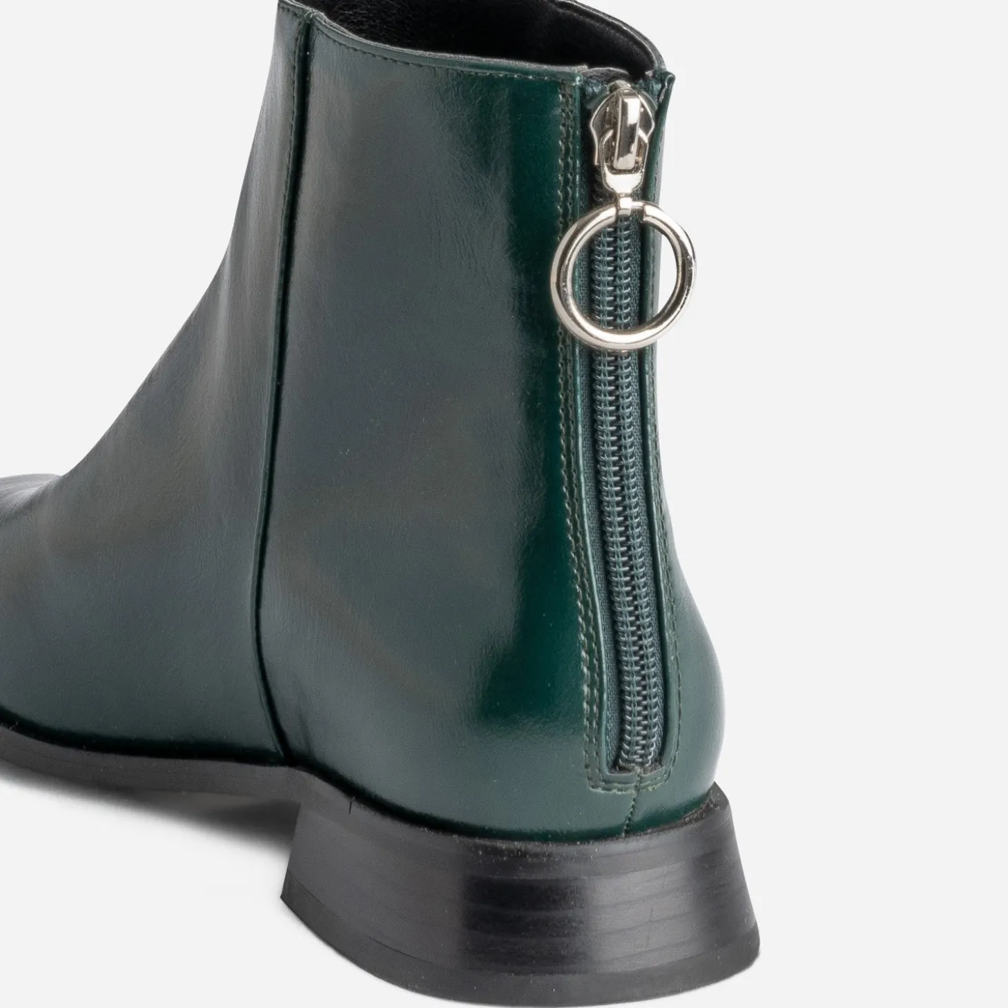 Finition glacée pour une brillance maîtrisée. Bout carré et talon décroché forme flare pour plus de modernité. Fermeture par zip à l’arrière du pied pour une belle originalité. Coloris vert foncé, pile dans la tendance. Ce boots femme est un véritable coup de cœur de la saison, à porter, avec tout, sans modération.