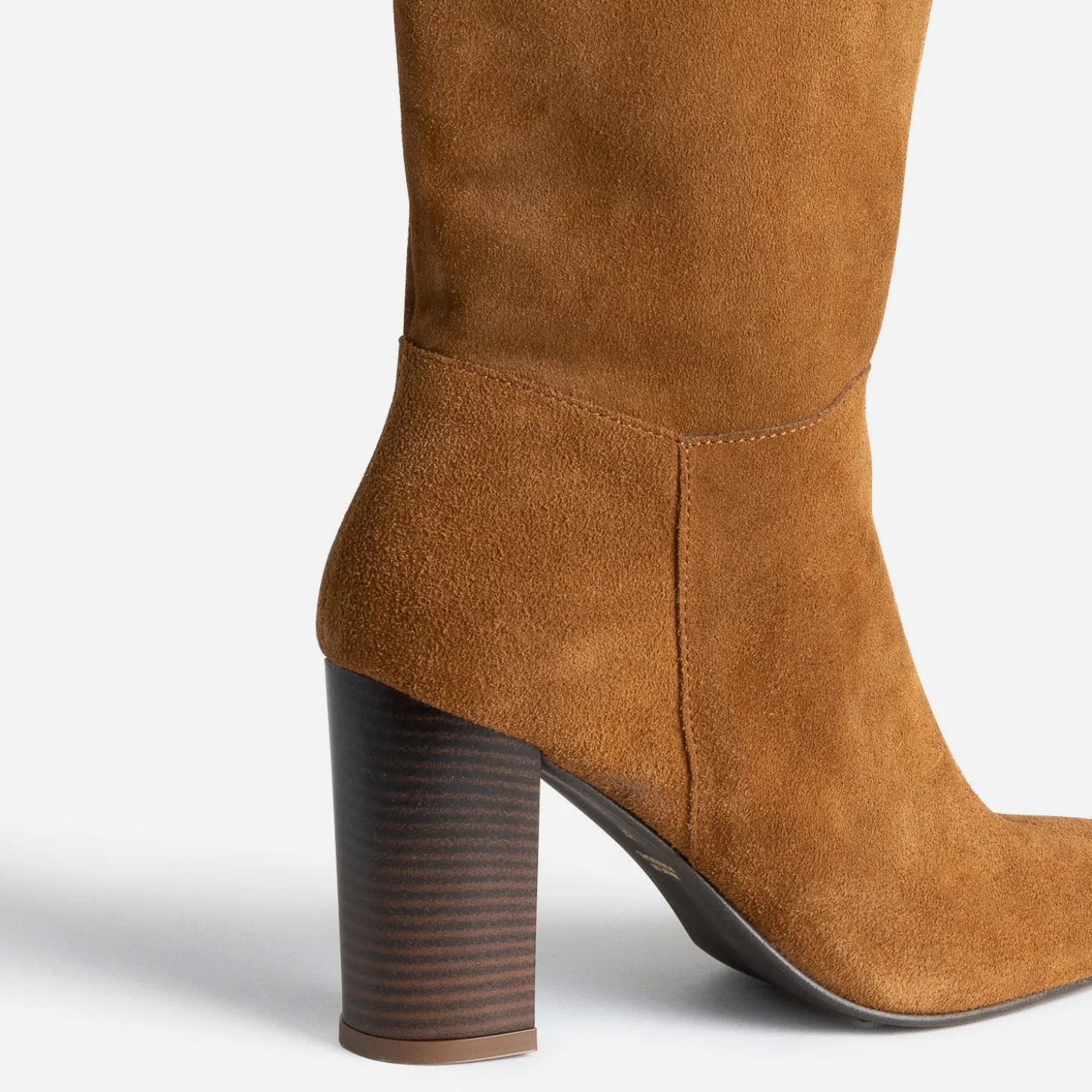 Ceci est une annonce. Cette botte femme frise la perfection. Par sa forme minimalisme, soulignée de découpes placées. Par son coloris cognac, élégant. Par son cuir velours et très souple. Par son talon haut de 8,5 cm. Par sa fabrication au Portugal. Idéal pour finaliser votre look, avec une robe midi à imprimé ethnique.