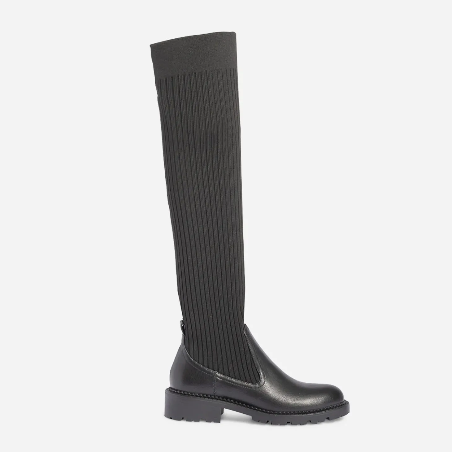 Duo de matières maîtrisé pour look ultra stylé. La botte pour femme n’a pas dit son dernier mot ! En cuir synthétique noir, elle se démarque par une tige élastiquée côtelée façon chaussette ton sur ton, qui vient complètement épouser la forme du mollet. Monté sur une semelle crantée, elle s’invite sur tous les catwalks urbains, en journée comme en soirée. Un modèle à privilégier avec un bas court, par exemple avec une jupe en tartan rouge, incontournable cette saison, et un pull à col roulé noir.