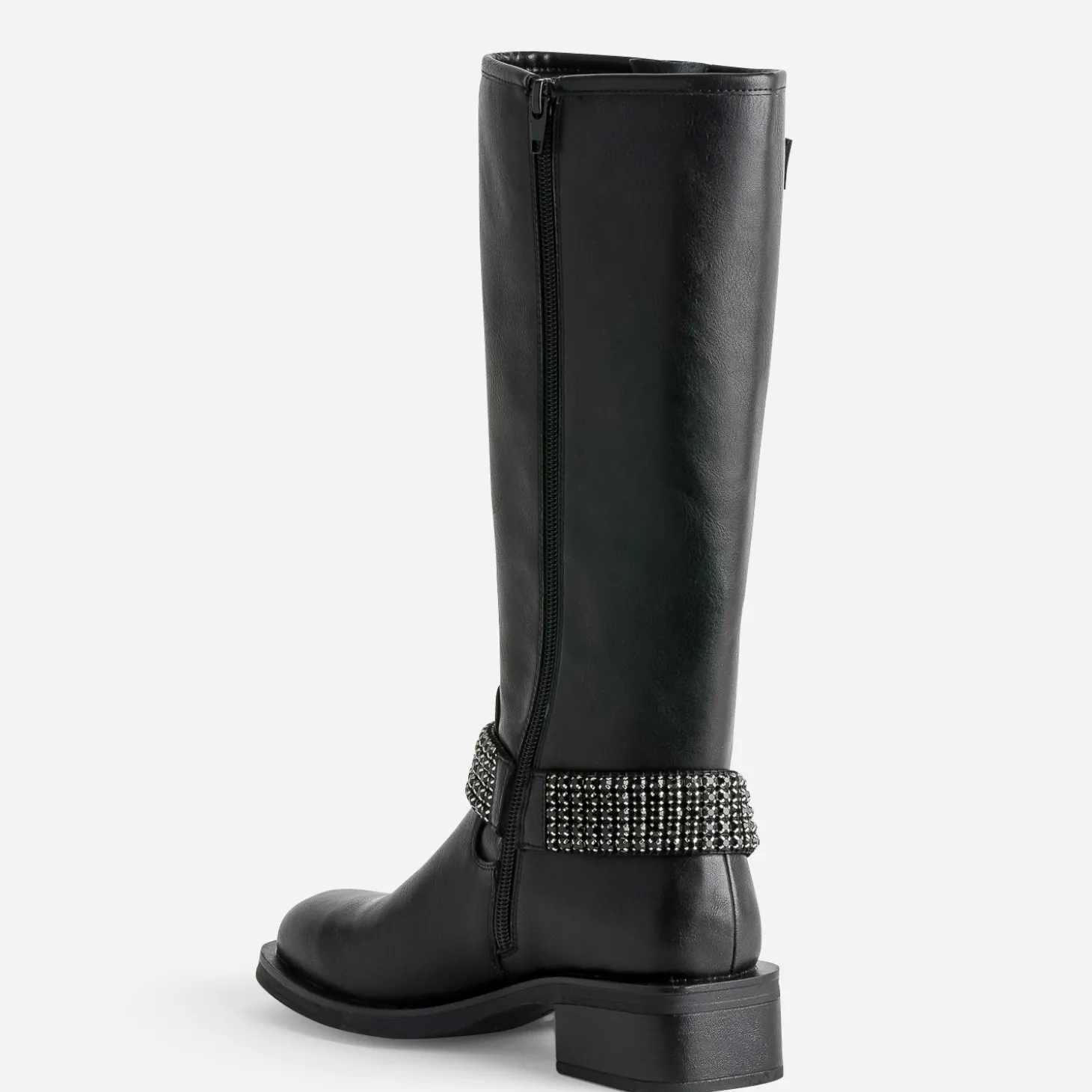LA nouvelle tendance mode incontournable de la saison, c’est l’esprit motard. Adoptez-le sans attendre, avec cette botte en matière synthétique lisse noire, soulignée, à la cheville, d’une large bride à anneau et rehaussée de strass. Bout et talon carré lui donnent du caractère. Fermée par un zip intérieur, elle présente un soufflet d’aisance en haut de la tige. Un modèle à imaginer en total look black, avec une veste de blazer et une mini jupe plissée ou un blouson en cuir et un jean slim.