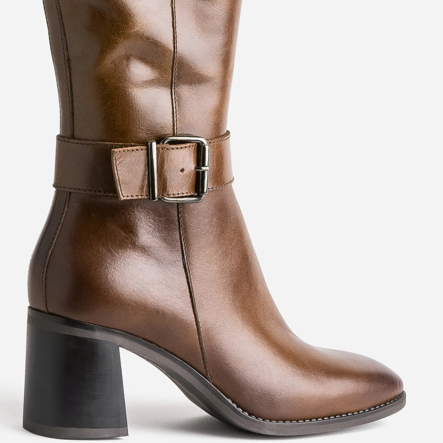 Admirez sa ligne sublime. Approuvez son cuir souple. Essayez son talon flare et son bout carré. Faites l’expérience d’une botte pour femme qui frise la perfection, rehaussant toutes les tenues d’une élégance rare. Marron, elle est soulignée d’une bride au niveau de la cheville et se ferme par un zip intérieur. Privilégiez-la avec une robe chasuble, une robe patineuse ou une robe longue, dans les tons vert foncé.