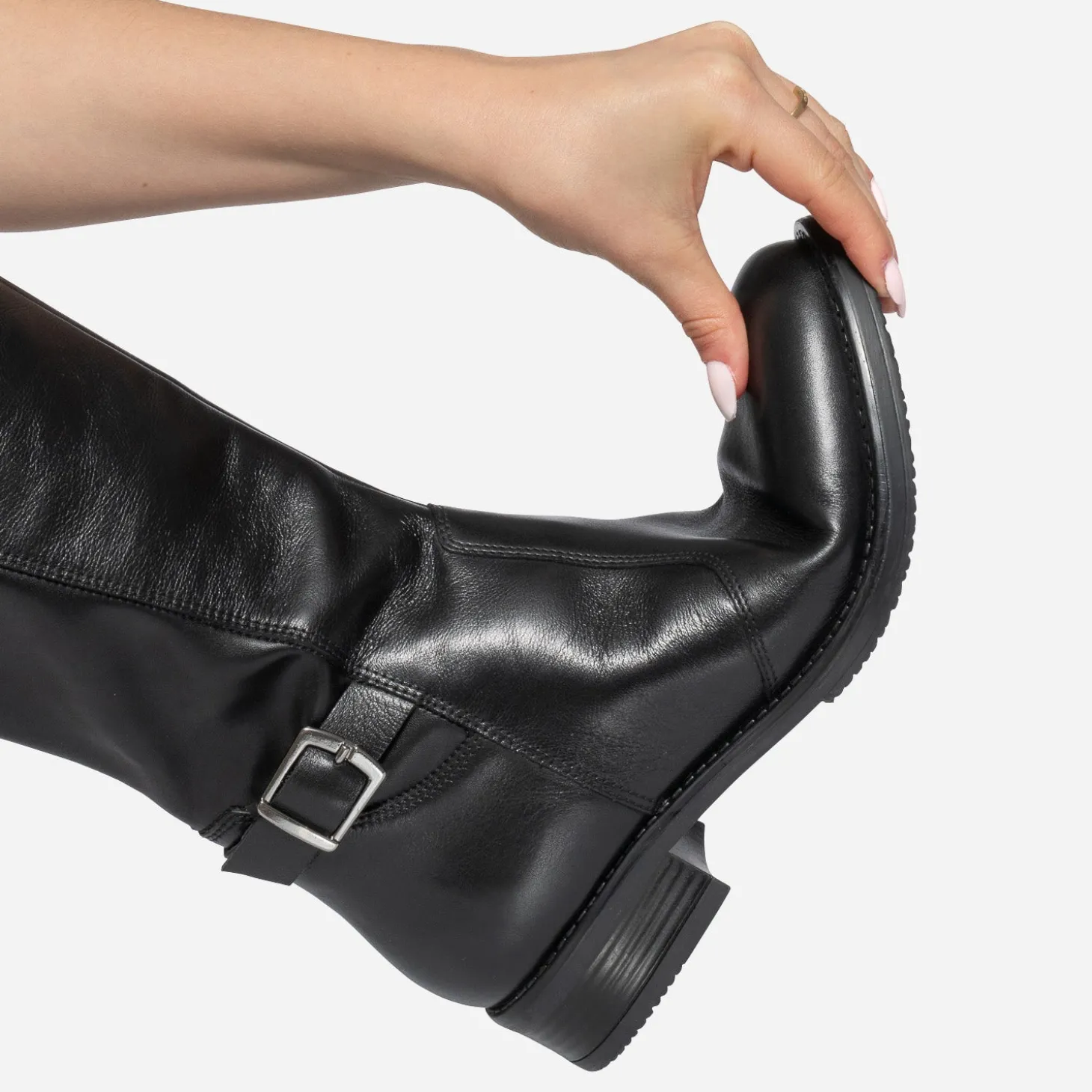 Soulignée par une bride placée à l’arrière de la cheville, la botte pour femme adopte l’esprit jodhpur. Elle doit son confort à sa tige, stretch à l’arrière du mollet et zippée sur l’intérieur. En matière synthétique noire, elle se porte de préférence avec une jupe ou une robe, courte, midi ou longue.