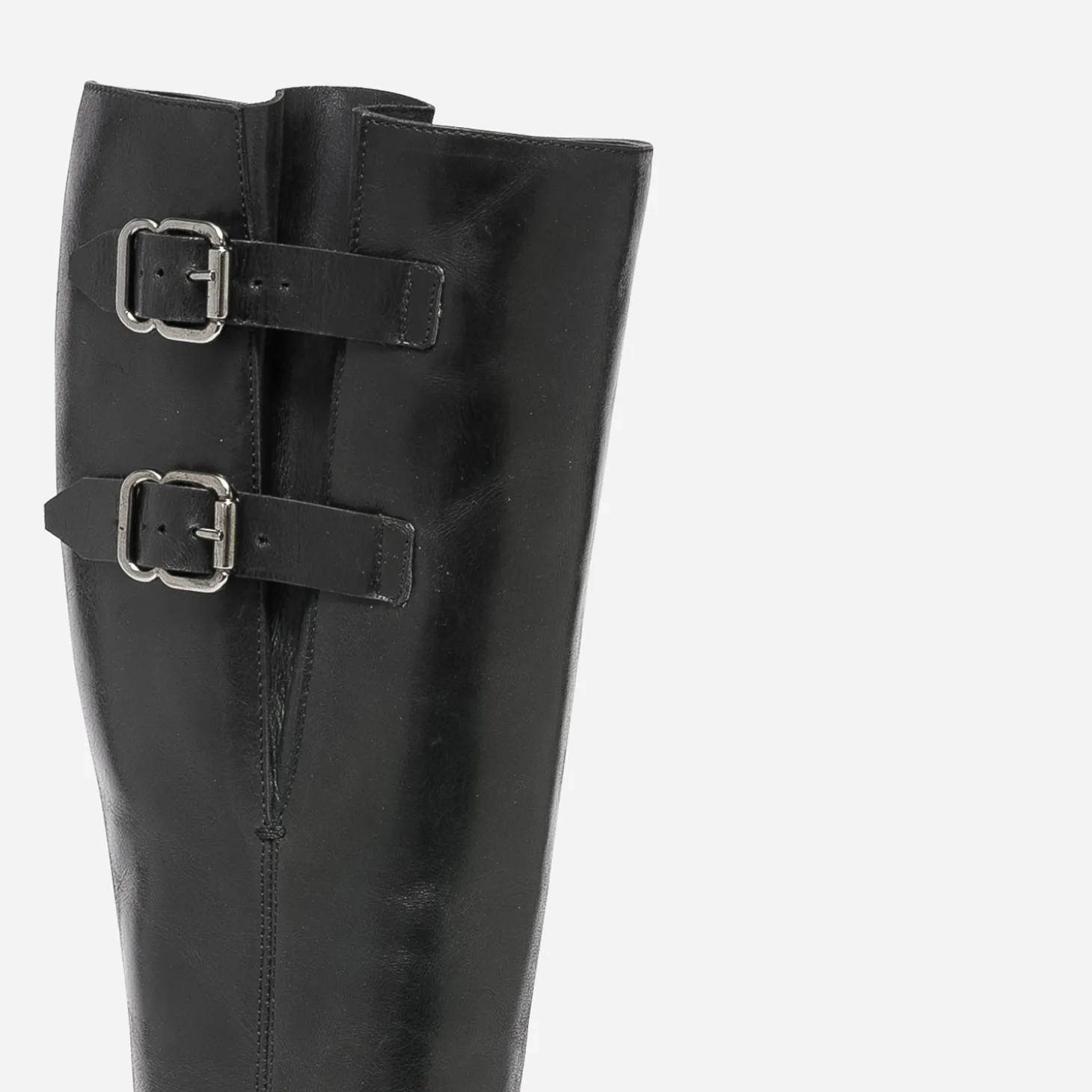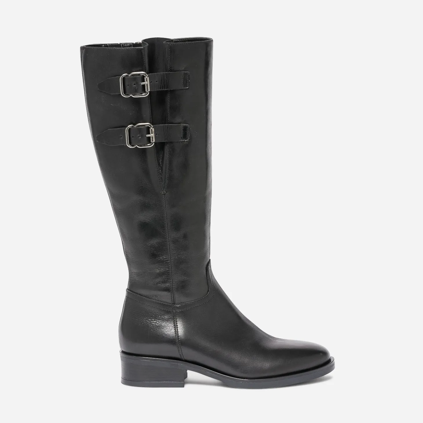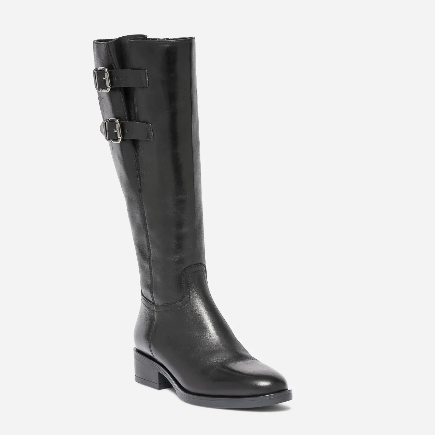 Cet hiver, le cuir est partout, et notamment en total look jusqu’aux pieds. Alors la botte est assurément votre meilleure alliée. Noire, elle présente une ligne classique, avec bout amande et talon décroché, et gagne en style et en confort, grâce aux deux pattes placées sur le haut de la tige et fermées par des boucles carrées en métal argenté : elles s’ajustent en fonction de votre tour de mollet. Jouez l’esprit militaire, avec des tons kaki ou gris.