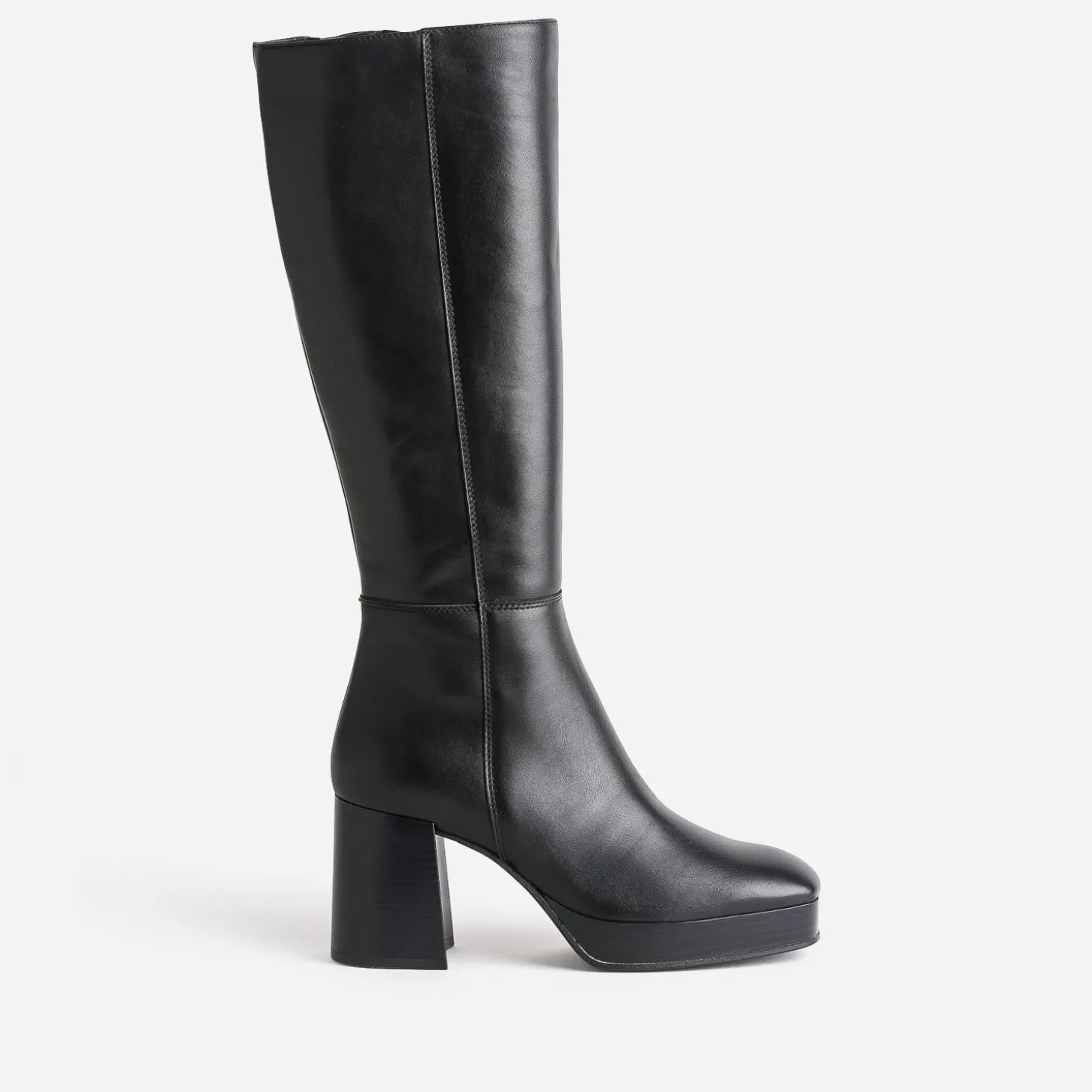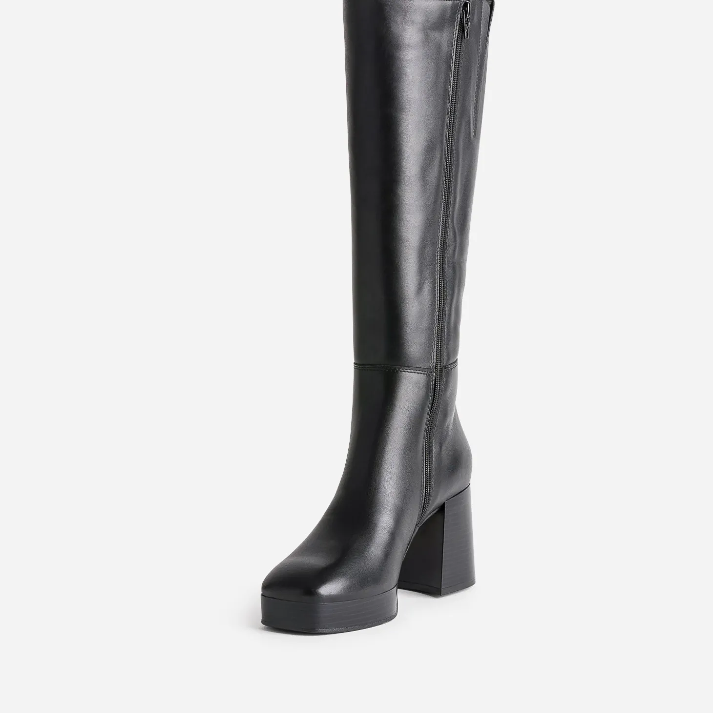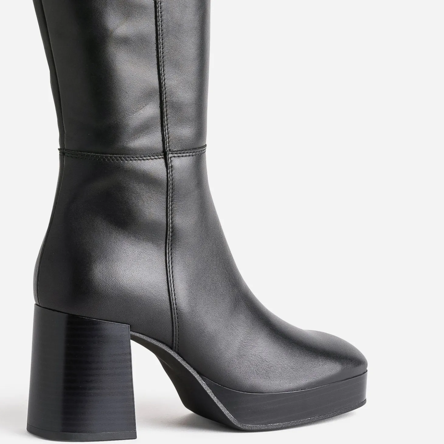 Une tige toujours plus haute. Un talon toujours plus flare. Une plateforme toujours plus disco. Laissez-vous tenter par cette botte femme. En cuir noir, elle est montée sur un talon de 8 cm et un patin avant de 2 cm. L’occasion de sortir en robe chasuble ou en mini-short à paillettes !