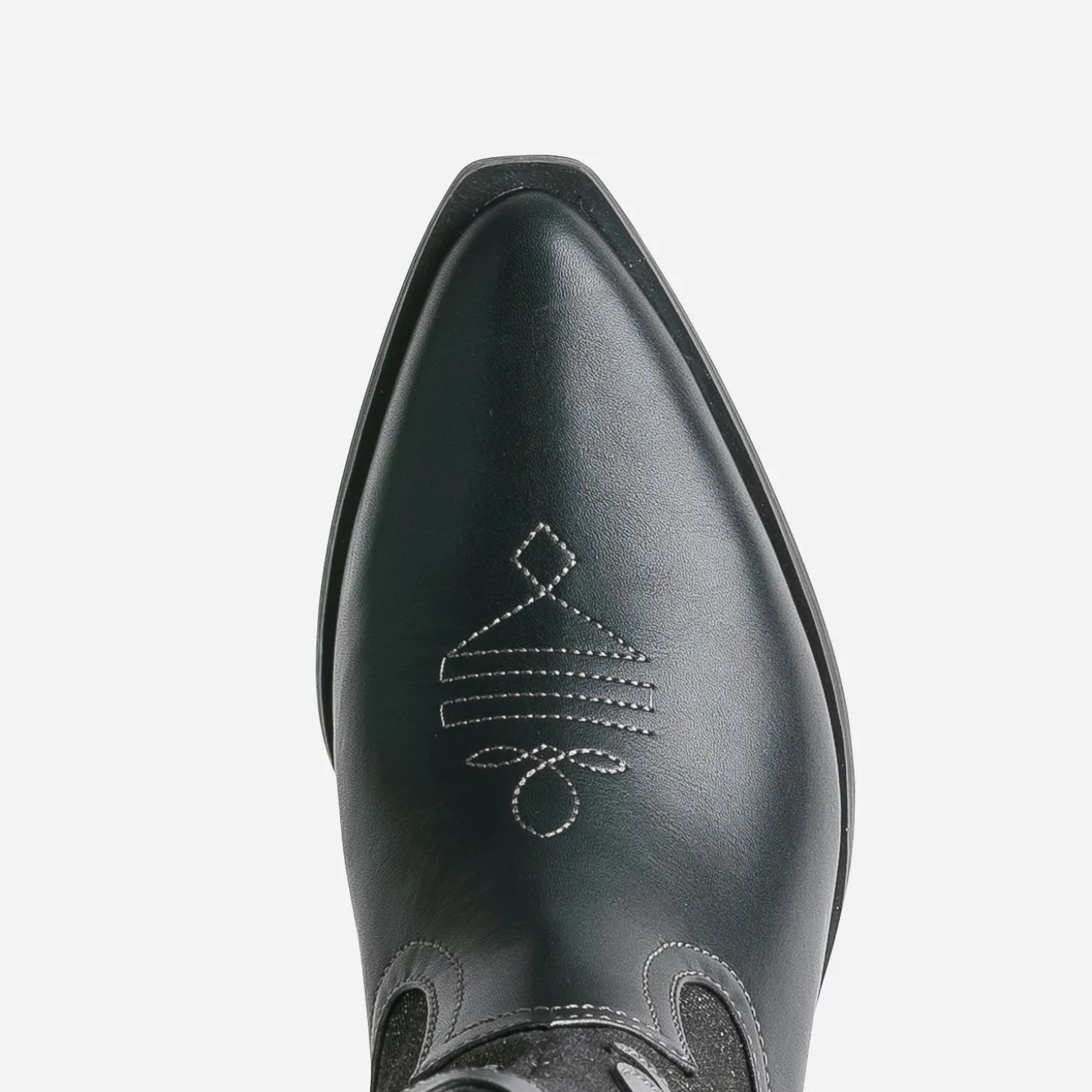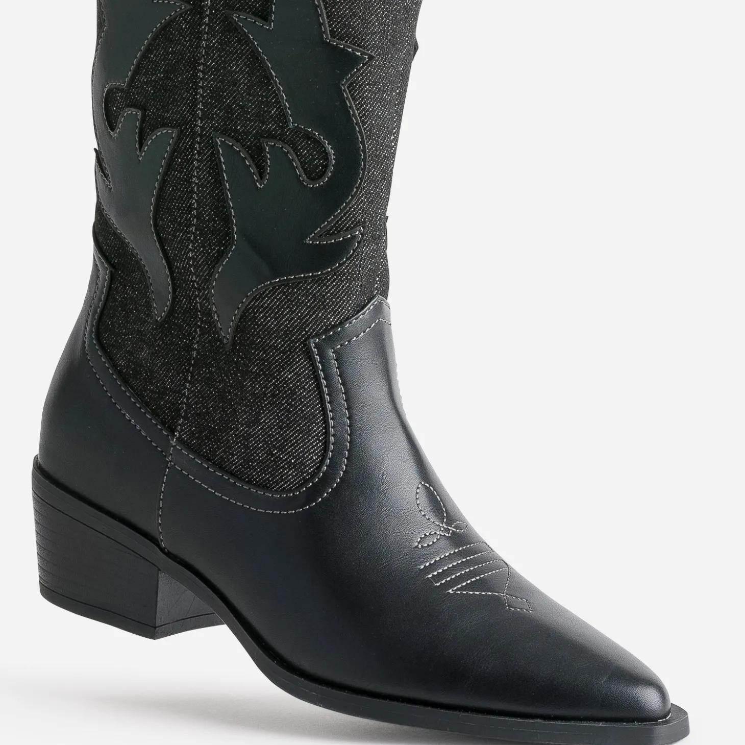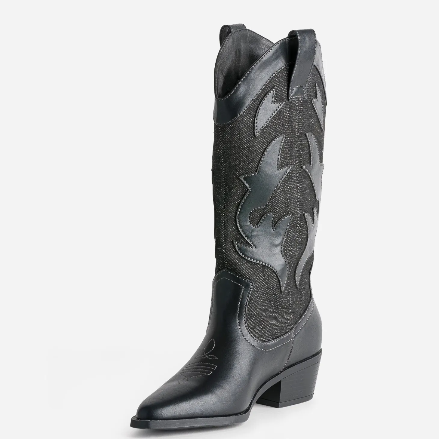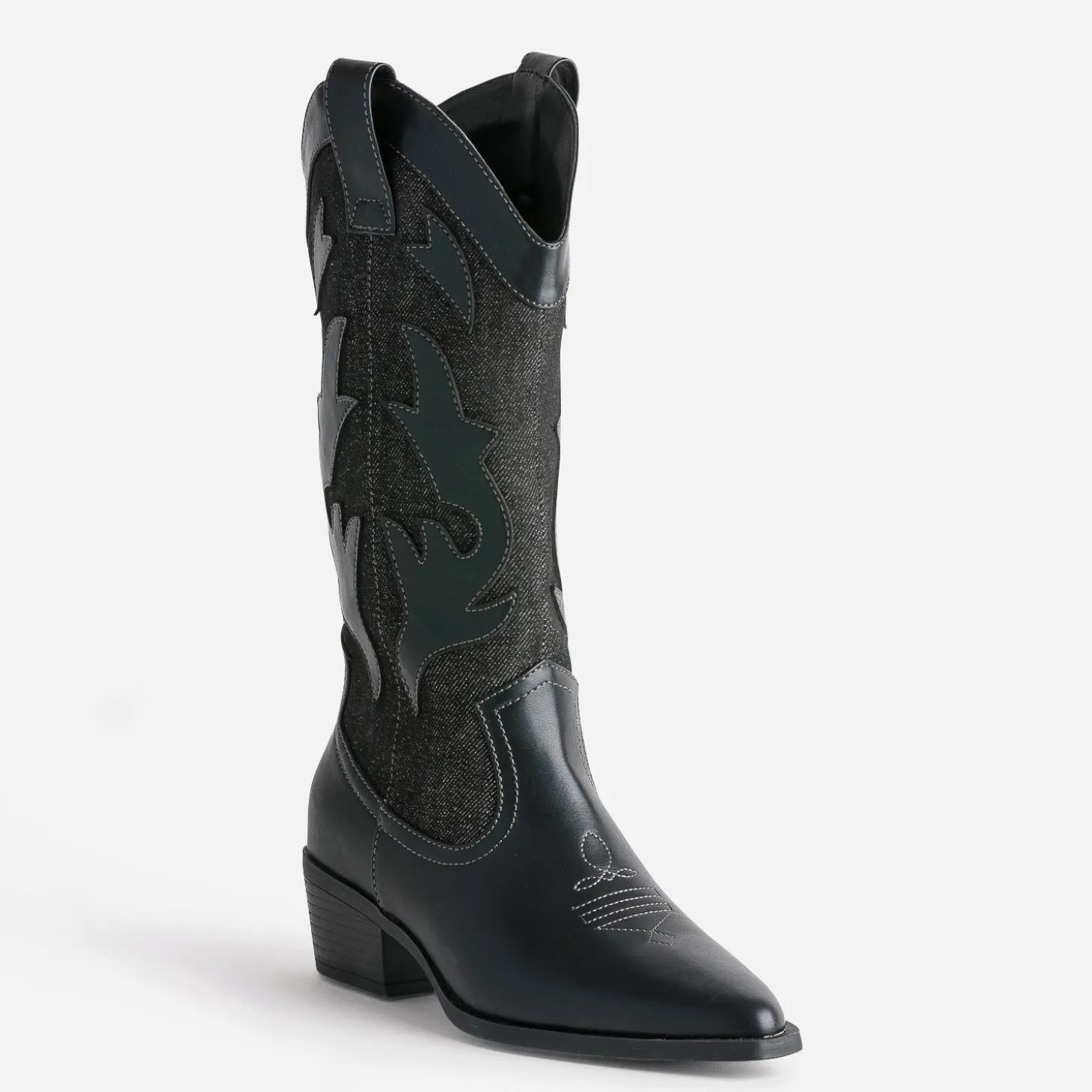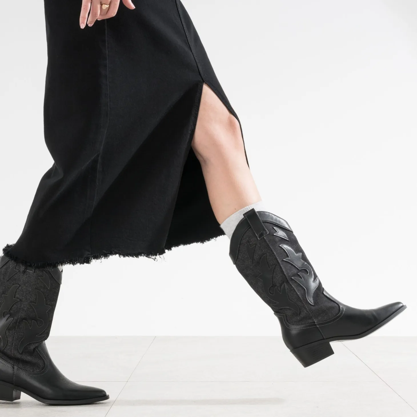 Rythmée de surpiqûres spécifiques, sur le dessus du pied et sur la tige, cette botte pour femme s’inspire clairement de la santiag. Bout pointu, talon bottier, elle s’enfile et se retire en une seconde. En textile façon denim, elle s’autorise une déclinaison grise et noire. Avec une chemise en jean, avec une jupe courte ou un slim, elle assure une touche rock, sans précédent.