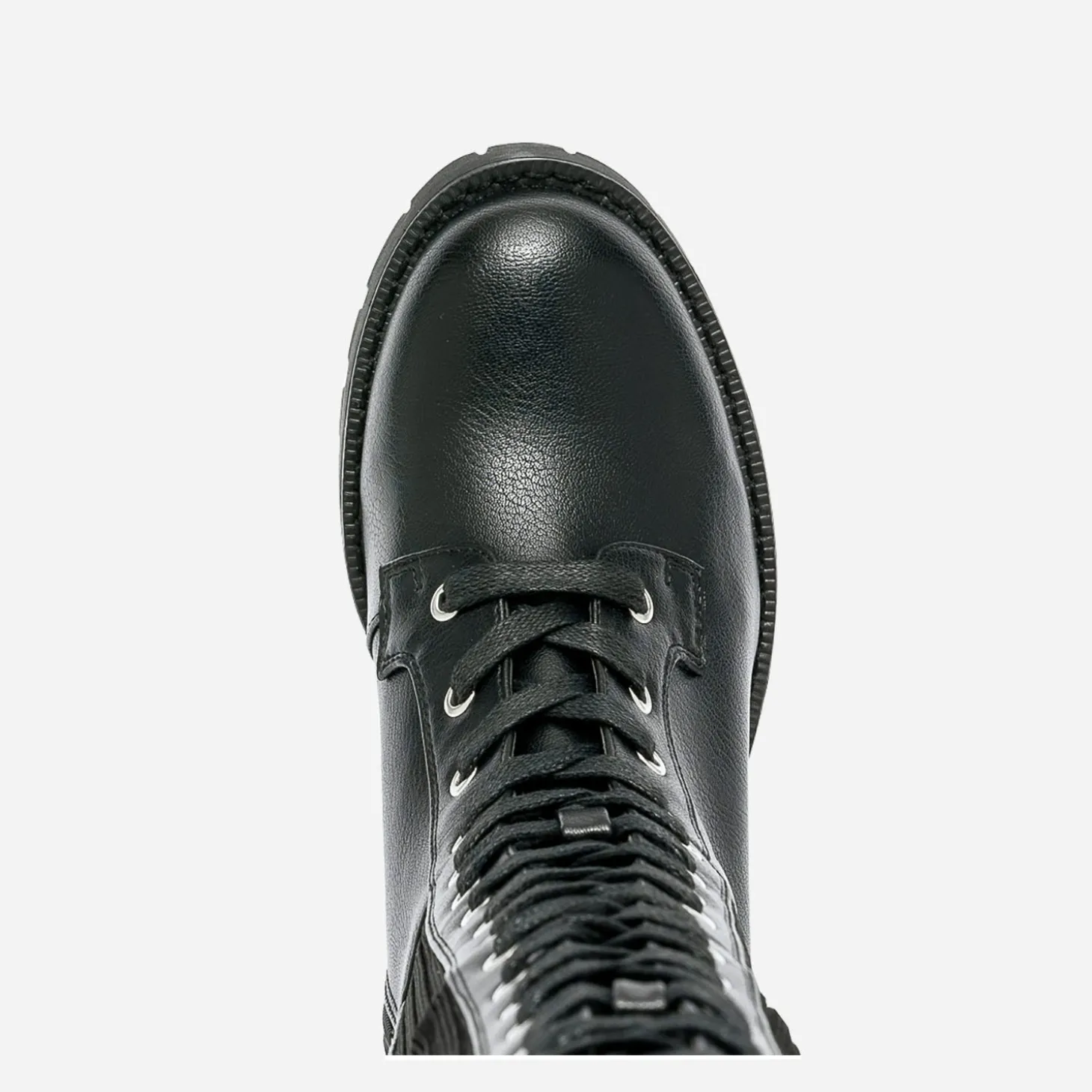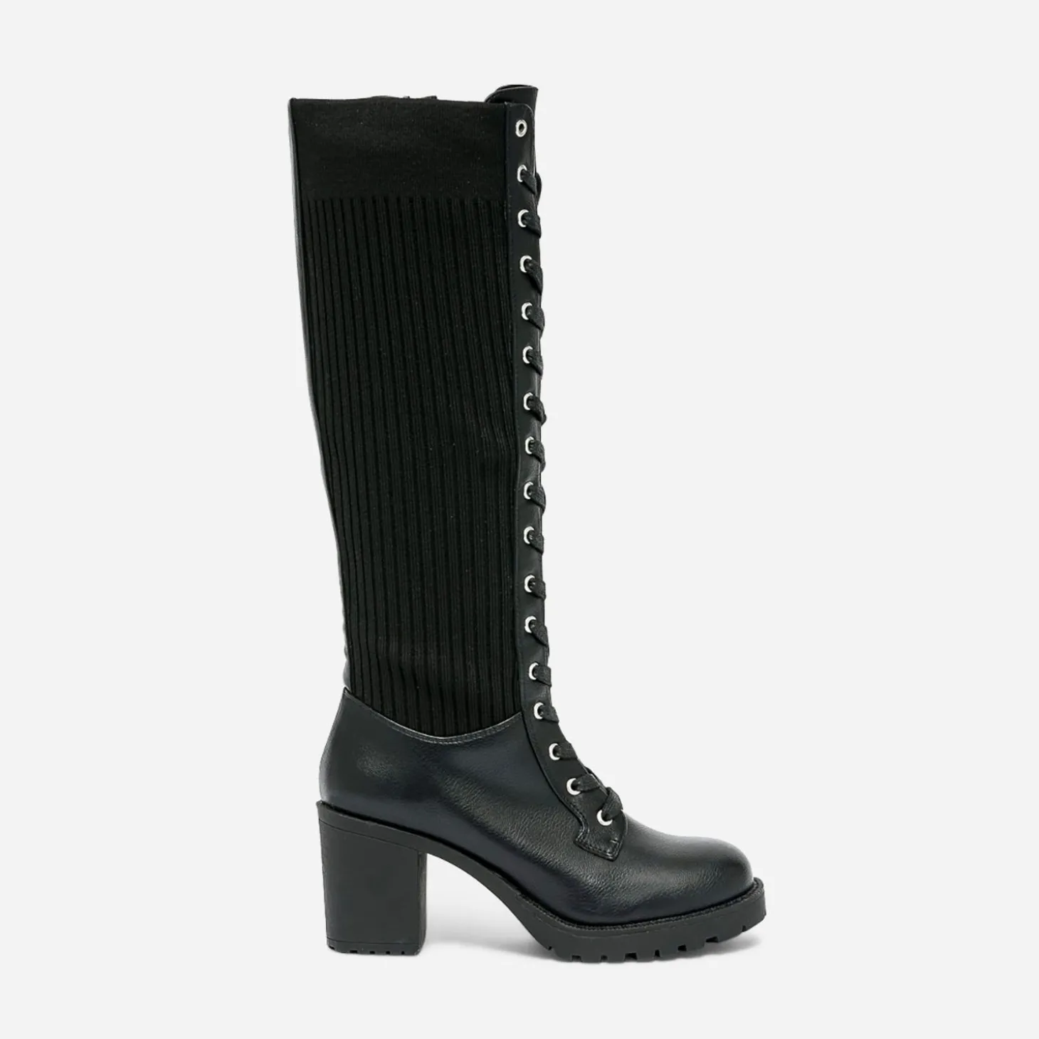 Et si vous bousculiez les modes ? Jouez avec la mode en chaussant cette botte pas tout à fait comme les autres. Elle doit son style rock voire grunge avec son mix de matières maîtrisé. Dessus synthétique et tige en textile côtelé, le tout en ton sur ton noir, fermée à la fis par un lacet et un zip intérieur. Un modèle qui épouse la jambe et mérite d’être exposé, sur des leggings ou des collants, avec pourquoi pas, un total look maille, ultra tendance.