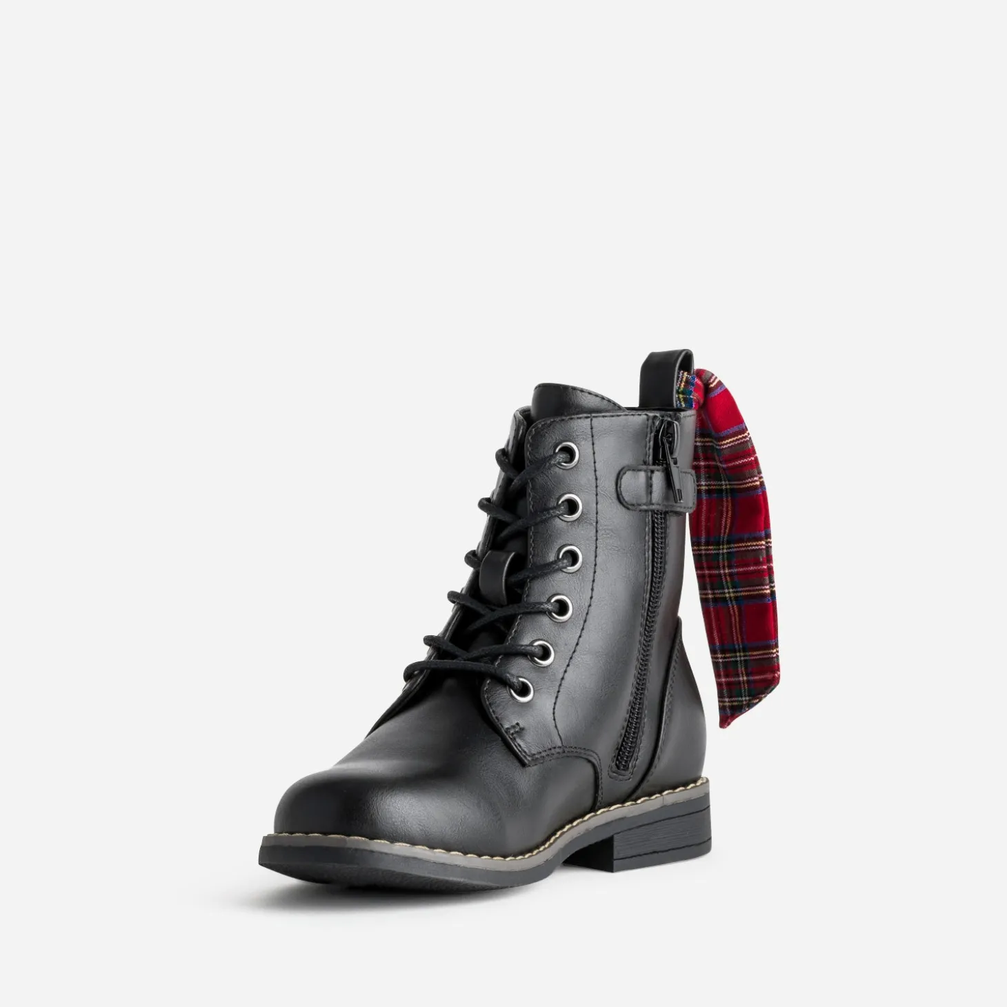 Celle que votre fille ne va pas quitter de si tôt, c’est la bottine. En cuir noir, elle monte au-dessus de la cheville et se ferme par un lacet, renforcé par un zip intérieur. Son détail qui change tout ? Des rubans amovibles, écru à motif léopard ou rouge à motif tartan, à nouer, ou pas, à l’arrière de la tige. Un modèle facile à associer avec ses looks de rentrée et de plein hiver.