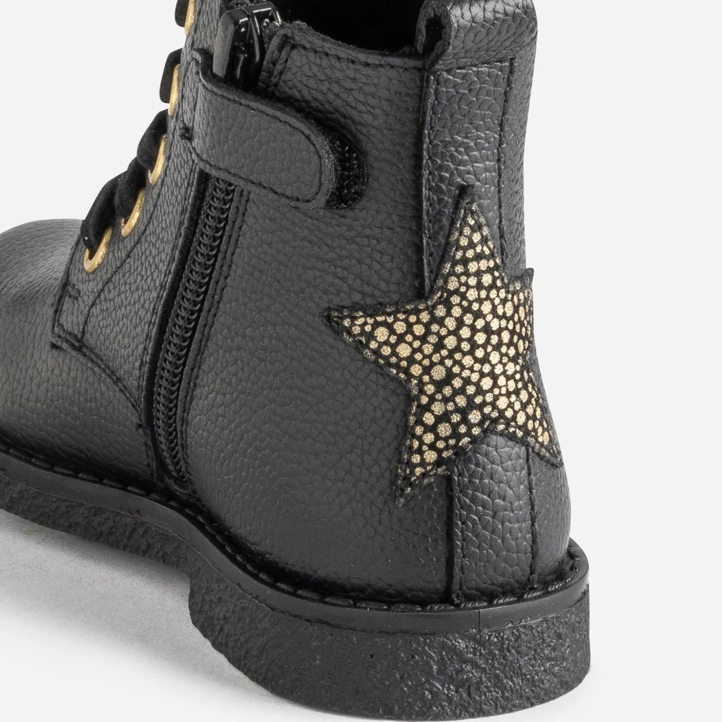 Confectionnée en cuir noir, cette bottine pour fille s’accorde aussi bien avec une robe en tulle noire qu’avec un pull et un jean slim. Un esprit rock renforcé par l’étoile dorée, posée sur le contrefort. Laçage, zip extérieur et scratch contribuent à maintenir le pied.