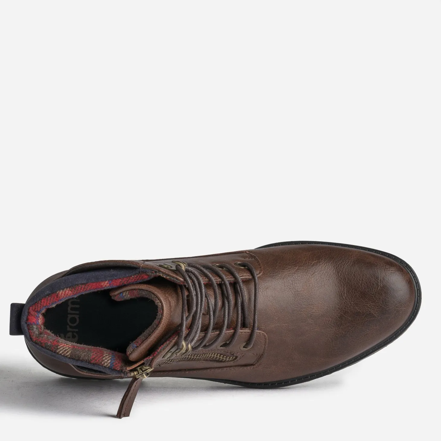 Réveiller l’esprit rock qui sommeille en vous, avec une bottine pour homme. En matière synthétique lisse, elle se décline en coloris marron, et dévoile une doublure à motif carreaux, dans les tons rouges et marron. La fermeture par lacet est renforcée par un zip extérieur. Un modèle à oser avec un total look denim.