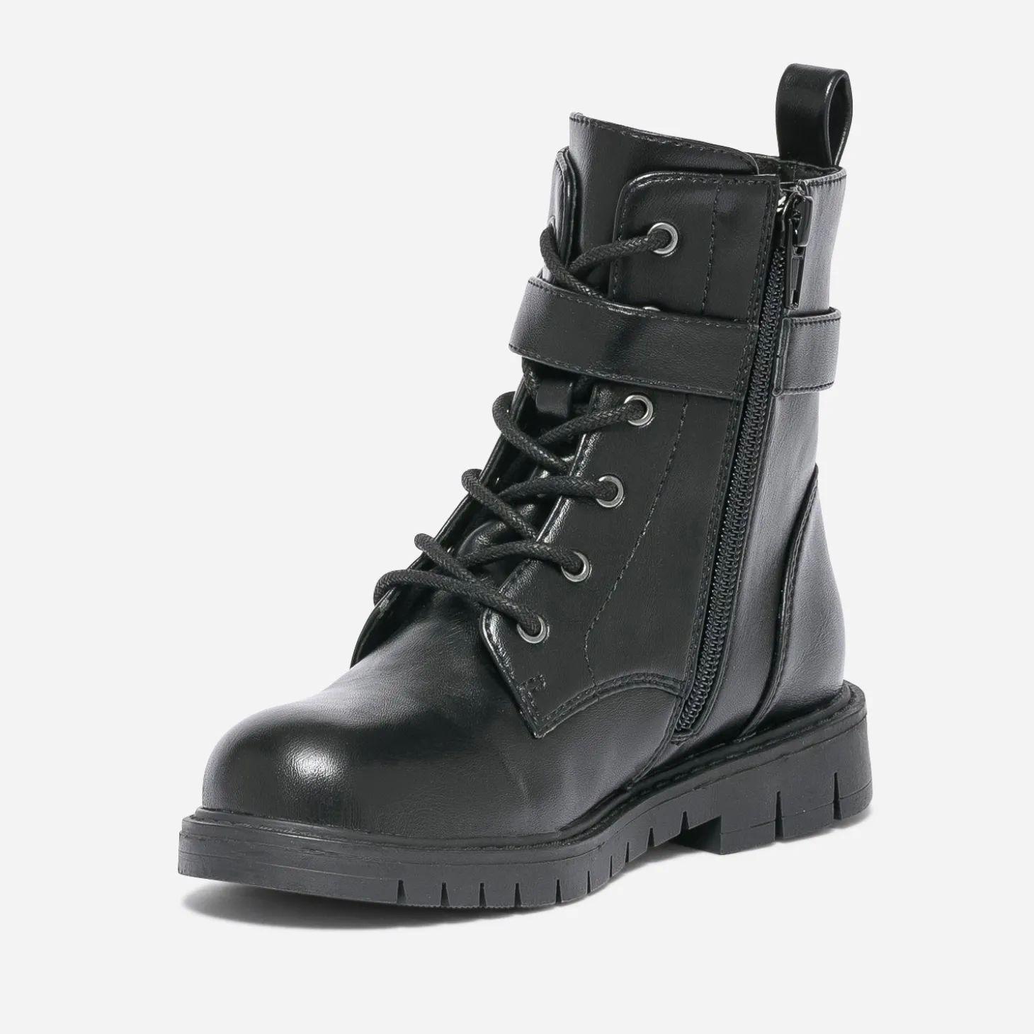 Loin de nous l’envie de faire marcher les enfants au pas. Pourtant cette bottine militaire est un modèle incontournable de la saison. Tige montante lacée et zippée, semelle crantée, elle présente même une bride à boucle sur la cheville. En matière synthétique noire, elle sera l’alliée des filles de la maison à la cour de récré.