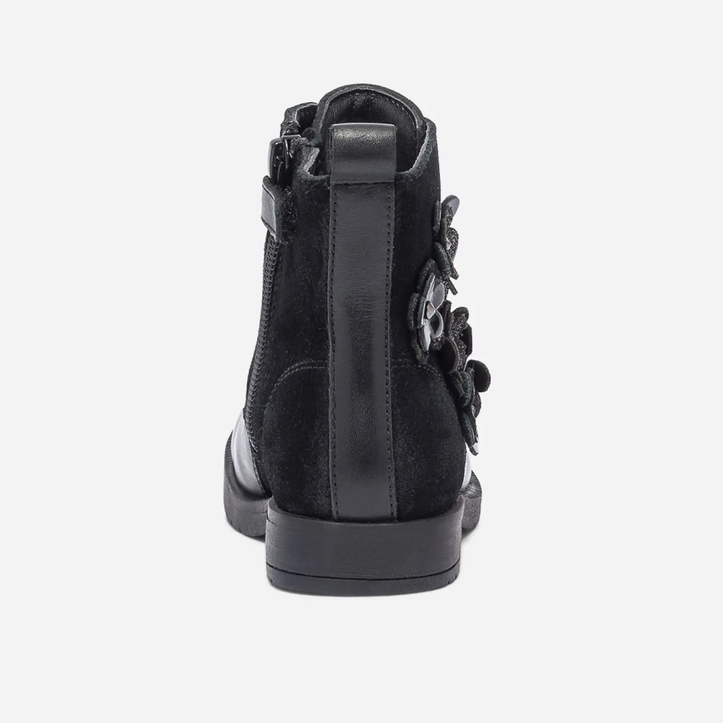 Voilà une bottine pour fille qui fait, des dualités, sa force de style. Noire, elle associe cuir lisse et cuir velours dans un équilibre parfait. Plutôt rock, elle s’adoucit d’un décor de fleurs 3D posées sur le côté. Fermée par un lacet, elle s’ouvre aussi plus facilement grâce au zip intérieur. Un modèle qu’elle devrait vite adopter !