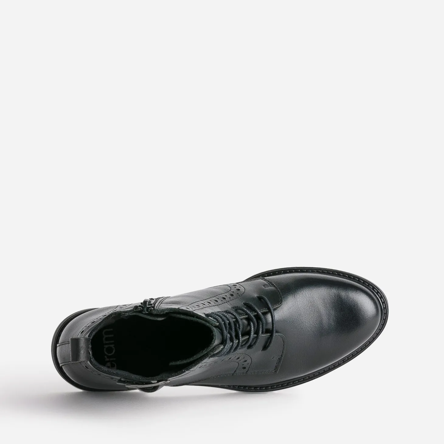 La saison est marquée par le retour du cuir en premier plan, à porter comme une seconde peau. La bottine n’y échappe pas ! En cuir lisse, elle opte pour un coloris noir, intemporel, et des détails de perforations sur la patte de laçage et le contrefort. Le zip intérieur facilite l’entrée et la sortie du pied. Un modèle à privilégier avec un blouson aviateur, un pull chaussettes, une jupe midi en cuir et des chaussettes hautes.