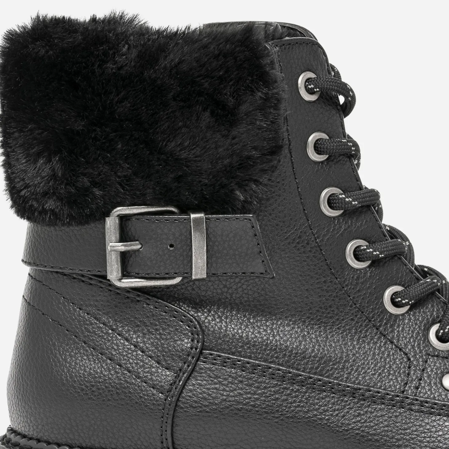 Nos critères de choix, pour sélectionner les chaussures d’hiver ? Une semelle crantée, pour une meilleure adhérence, une doublure fourrée pour réchauffer de la cheville au bout des pieds, une première en cuir pour le confort, et un lacet, renforcé par un zip latéral, pour gagner du temps. Impossible de faire sans ! Cette bottine pour femme coche toutes les cases. Conçue en matière synthétique, déclinée en coloris noir, elle s’accorde avec des teintes sobres et sombres.